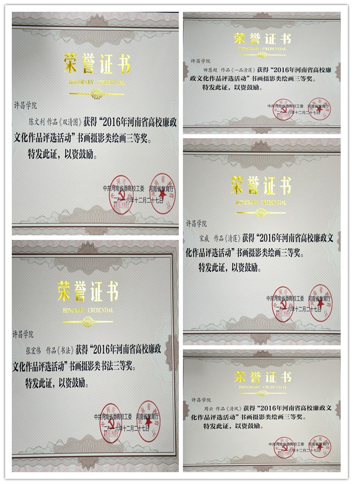 近日,中共河南省委高校工委、河南省教育厅《关于公布全省高校廉政文化作品评选结果的通知》(教思政〔2016〕1069号)对2016年全省高校廉政文化作品评选获奖者予以表彰。美术学院陈文利院长的《双清图》、田慧超老师的《一品清莲》、周云老师的《清风》、宋威老师的《清莲》获廉政文化作品书画摄影类绘画三等奖。张宏伟老师的《书法》获廉政文化作品书画摄影类书法三等奖。