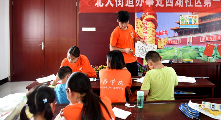 今天,许昌没有了烈日的炙烤,大雨的天气丝毫阻止不了队员们的实践。早上九点,实践队员们准时来到了西湖社区,虽然今天只有三名同学前来学习,但他们的热情丝毫不减,把三名同学团团围住,生怕落后!实践队员们为小朋友们设定了简单易懂的小简笔画手绘、和一些最简单的蜡笔画。由于面对的群体是四到八岁的孩子,教学虽然是主题但不是我们唯一的目的,为了让孩子们在快乐中收获知识,队员们利用下午空余的时间跟孩子们一起做趣味互动,争取让家长满意、让孩子收获知识的同时收获快乐。