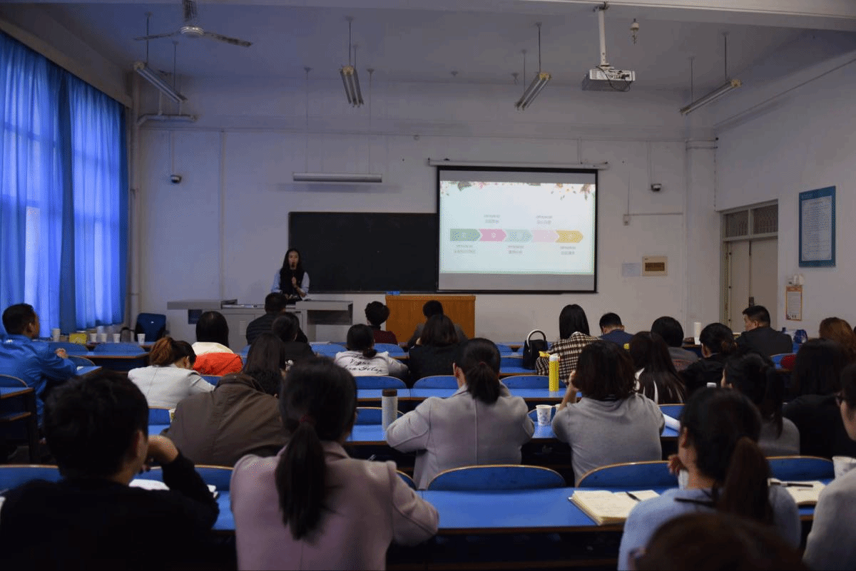 随后,河南省辅导员技能大赛中一等奖获得者、美术学院辅导员杨晨老师,以PPT的方式与辅导员老师们分享了辅导员大赛的意义,讲述了辅导员大赛的相关流程。杨晨老师着重就“基础知识”“主题班会”“谈心谈话”“主题演讲”等方面与辅导员老师们分享了备赛经验、相关备赛技巧,说到要内化理解、逐一记忆、灵活运用、融会贯通。杨晨老师经过不懈努力,突破重重选拔,成功在河南省辅导员技能大赛中荣获一等奖的好成绩。在交流参加辅导员大赛的感悟时讲道:“要有明确的目标,详细的计划与规划,同时还要有着坚定的毅力,能吃苦,使自己充满拼劲”。