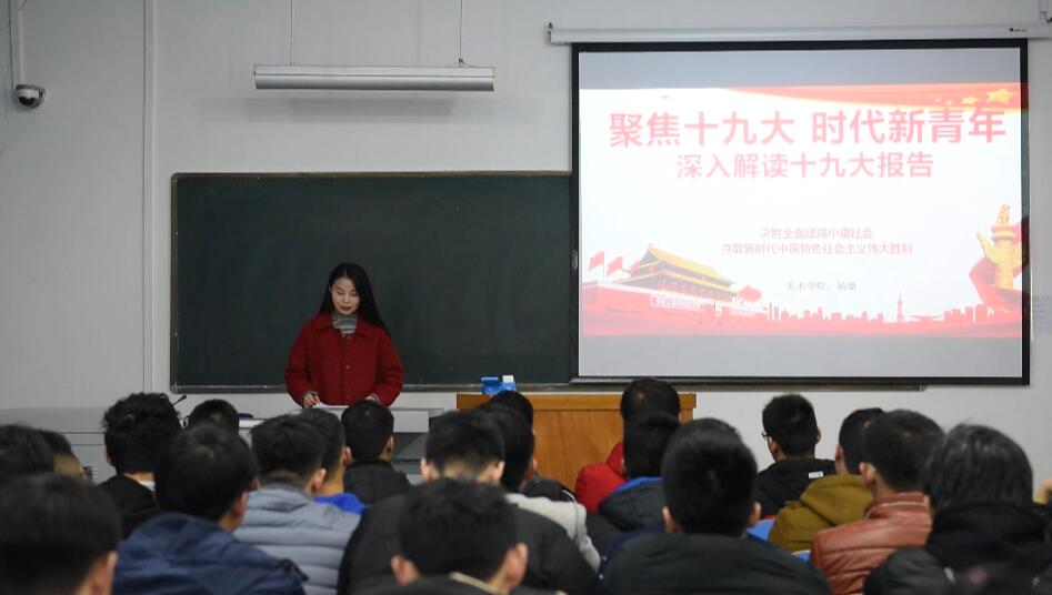 为了学习党的十九大精神,调动广大青年学生学习的积极性。12月8日,美术学院团总支书记杨璐老师在艺术楼205教室开展了以“聚焦十九大,时代新青年”为主题的宣讲。
