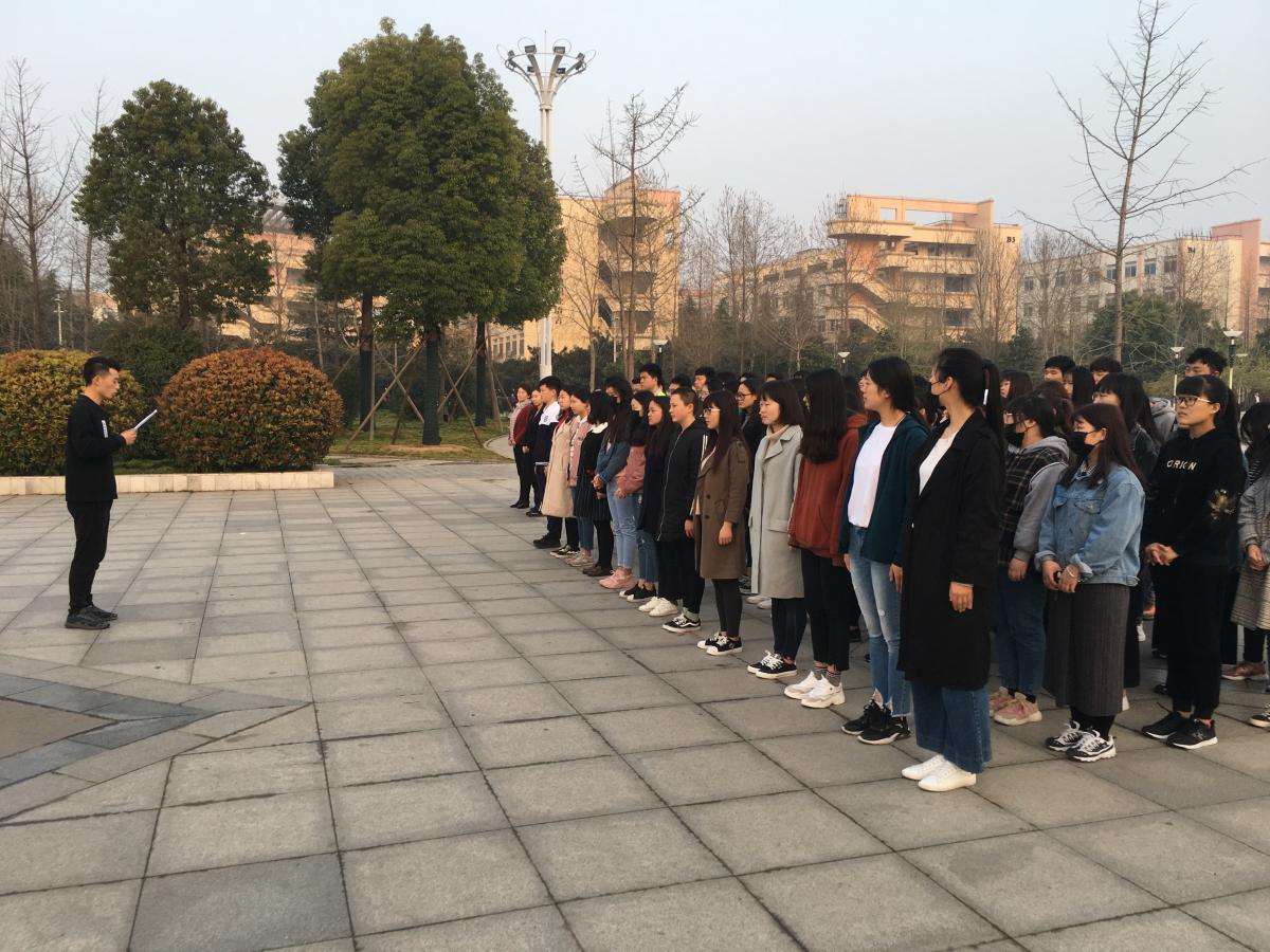 3月27日,美术学院全体大一学生到达国旗台前参加升旗仪式。