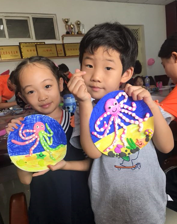 实践队的授课算是进入了正式阶段了,小朋友们全神贯注的盯着黑板,孩子认真的同时也给实践队员们带来极大的鼓舞。今天春田花花实践队学习的是“乱挠痒痒的大章鱼”彩泥制作。实践队员给小朋友们进行示范,五颜六色的彩泥一下子就吸引了他们的目光。经过一步步裁纸、涂色,再把彩泥固定上去。孩子们都十分认真,经过一上午才把作品完成。然而有几个小朋友因过于偏爱自己的作品,怎么说都抓住自己的作品不放,最后在老师和家长的共同劝说下才依依不舍的交了。实践队员们细心的给小朋友们进行解释,告诉他们好的作品会贴到墙上,进行评比,还会有小奖励。小朋友们的眼中都充满了期待。