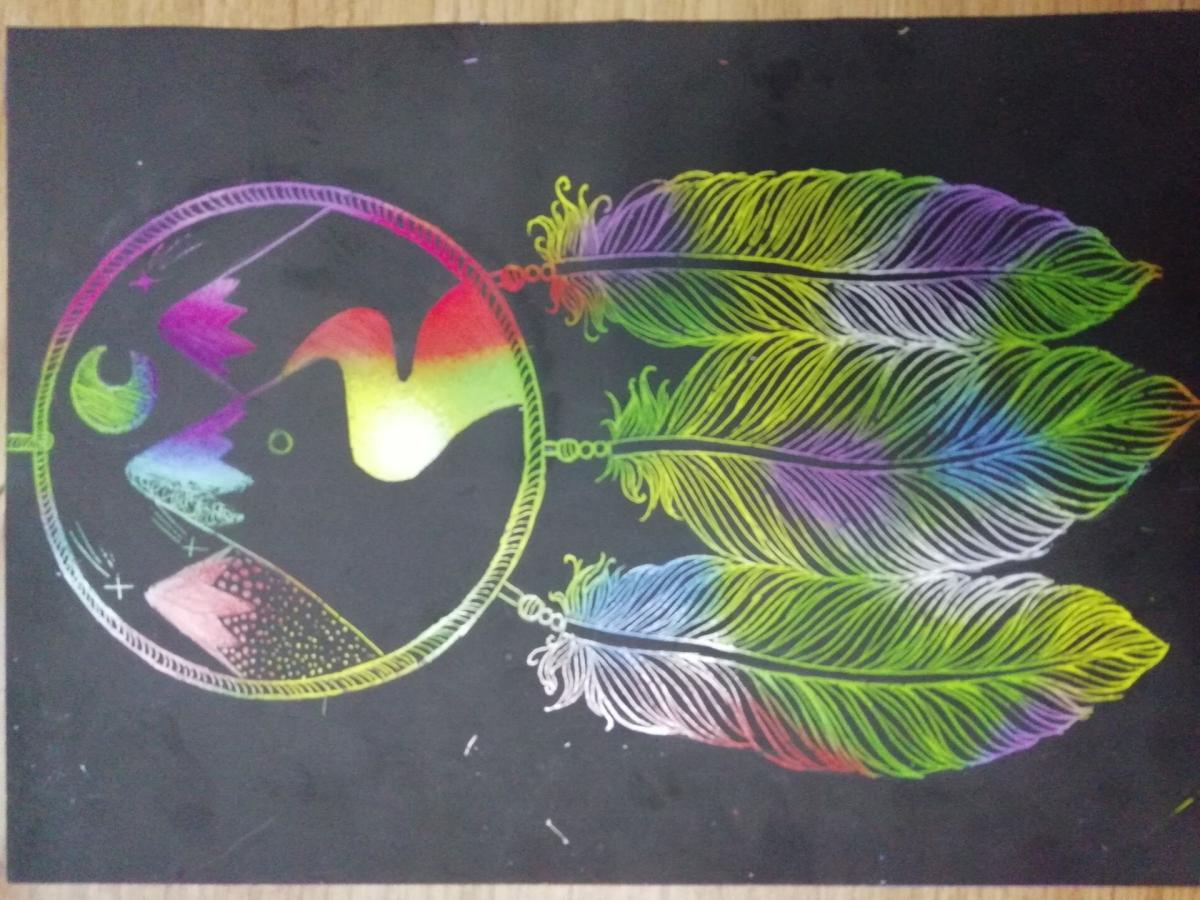 刮画,又名刮蜡、刮美卡。是一种新型的绘画方式。除了用竹笔在刮画纸上进行绘画创作以外,我们还可以配合其它工具进行作画,丰富画面效果。如:牙签、用完水的水笔圆珠笔、竹筷、回形针等等。尖的用来画细线条,更好地表现细节;扁平的有一定宽度的工具可以用来画粗犷的线条或者是面。 刮画纸是一种双层艺术类纸品,上层主要为黑色,下层为单色或迷彩色,刮去上层的黑色便露出下面的彩色,色彩靓丽,对比强烈,有着良好的视觉效果,深得小朋友的喜爱。刮画不适合反复修改,可以锻炼孩子果断的作画习惯。