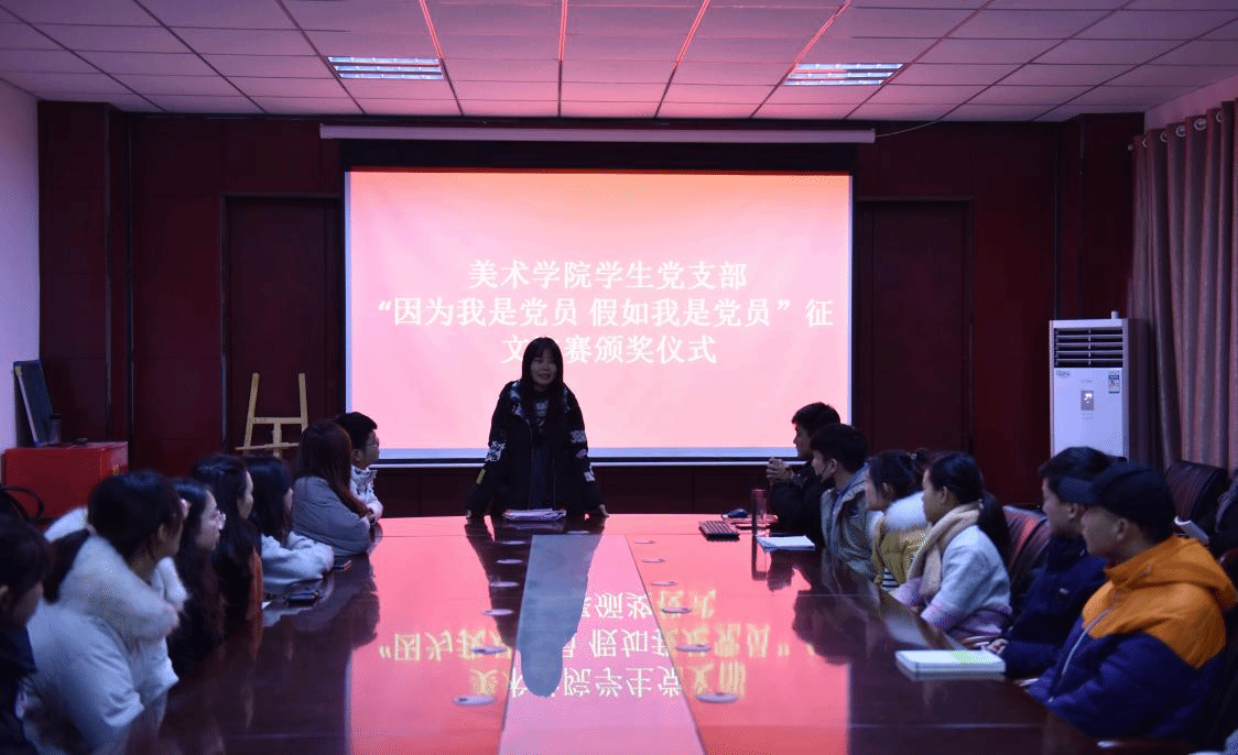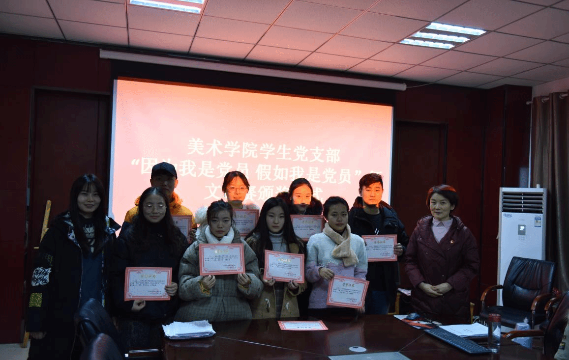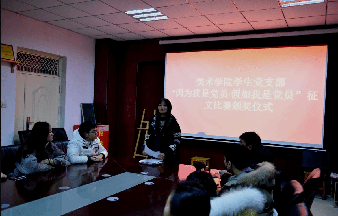 此次颁奖仪式由美术学院学生党支部书记杨璐主持,美术学院党总支副书记吴艳艳对获奖的同学颁发了证书及奖品。活动最后,学生党支部书记杨璐充分肯定了此次征文比赛的重要意义。她希望全体党员和入党积极分子要不断加强学习,学习政治理论,学好专业知识,学习身边的先进分子,在平时的学习工作中严格要求自己,时时处处要体现作为党员、入党积极分子的先进性,在青年学生中树立先进群体的良好形象。