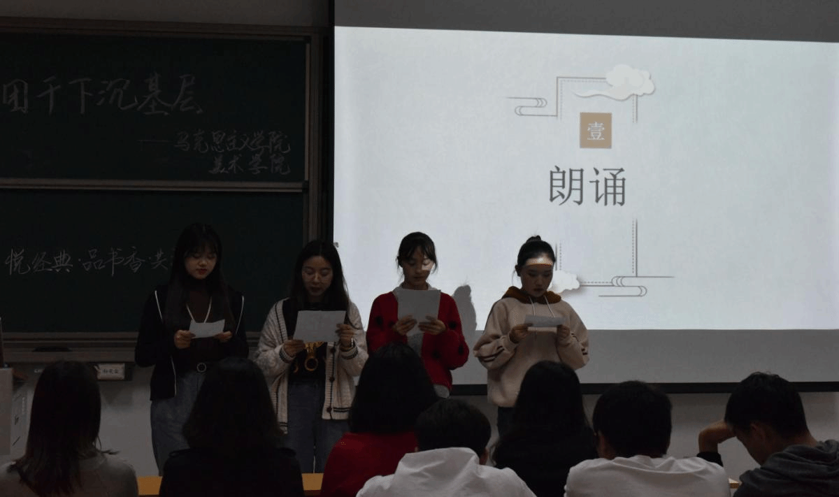 2019年4月29日晚,美术学院和马克思主义学院在文科综合楼306开展以“悦经典·品书香·共成长”为主题的团干下沉基层活动。此次活动由美术学院和马克思主义学院的团员,团干部共同参加,马克思主义学院组织部蒋鑫宇同学主持。