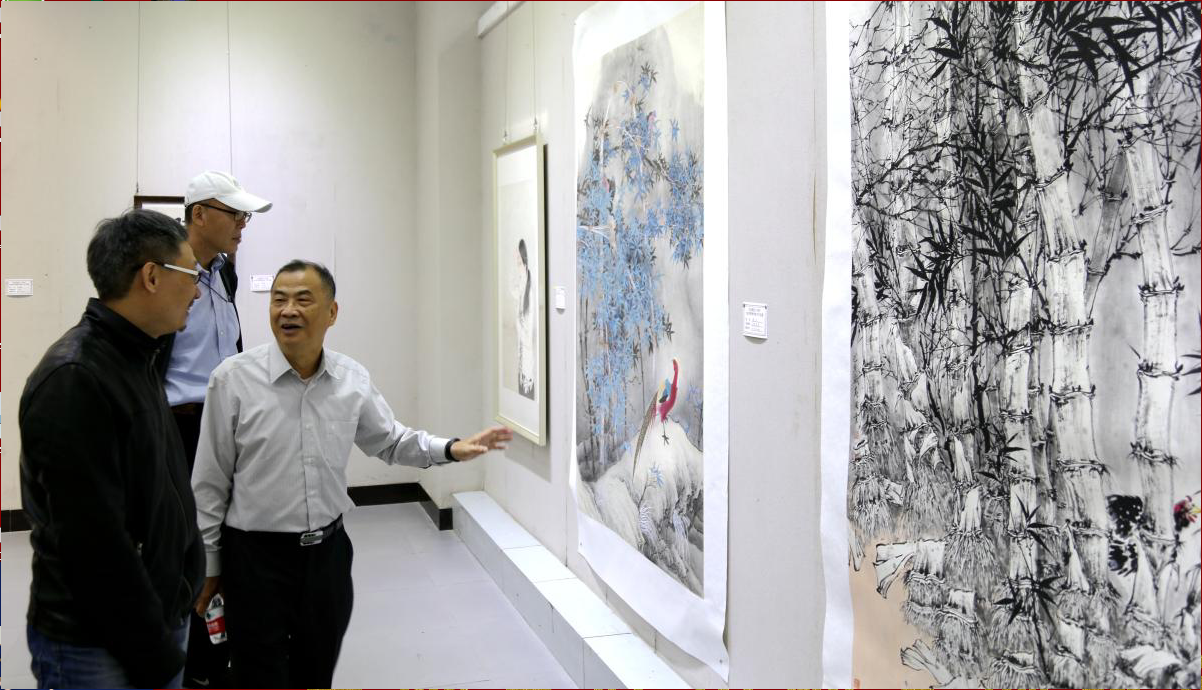 开展的第二天,我院有幸迎来了台湾加工出口区产业工会联合会代表前来参观,美术学院副院长张少华老师亲自陪同讲解。联合会代表饶有兴致地观看了展出作品,特别对中国画作品表现出浓厚的兴趣,对美术学院教师的艺术创作给予了较高的评价。
