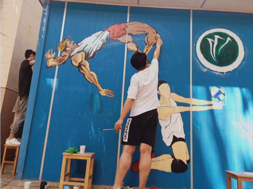 7月1日清晨,美术学院新农村新面貌内乡墙绘队应邀为体育学院绘制文化墙,在赵鹏飞老师的带领下,实践队20名学生在羽飞田径场门口集合,开始了第一天的实践活动。
