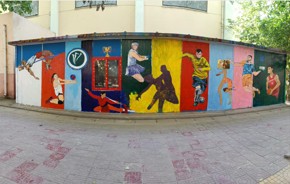 时值七月,天气炎热,但实践队学生们的热情并没有丝毫的削减,在商议讨论确定了绘图方案和分工后,便兴致勃勃的开始了对墙体的“大改造”。实践过程中,尽管汗水湿透了衣襟,身上沾染了颜料,学生们也没有因此停下画笔或是发出抱怨的声音,偶尔存在意见分歧,也会及时协商解决。经过学生们不懈的努力,原本空白单调的墙面变得绚丽多彩,路过的行人纷纷驻足为实践队学生们投来了赞许的目光,这是对学生们劳动成果的最大肯定。令人欣慰的是,体育学院的师生全程陪伴在实践队学生们的身边,这也是对实践队学生们的鼓励与帮助。活动结束后赵鹏飞老师进行了总结,对学生们一天的工作给予了高度的认可与表扬。