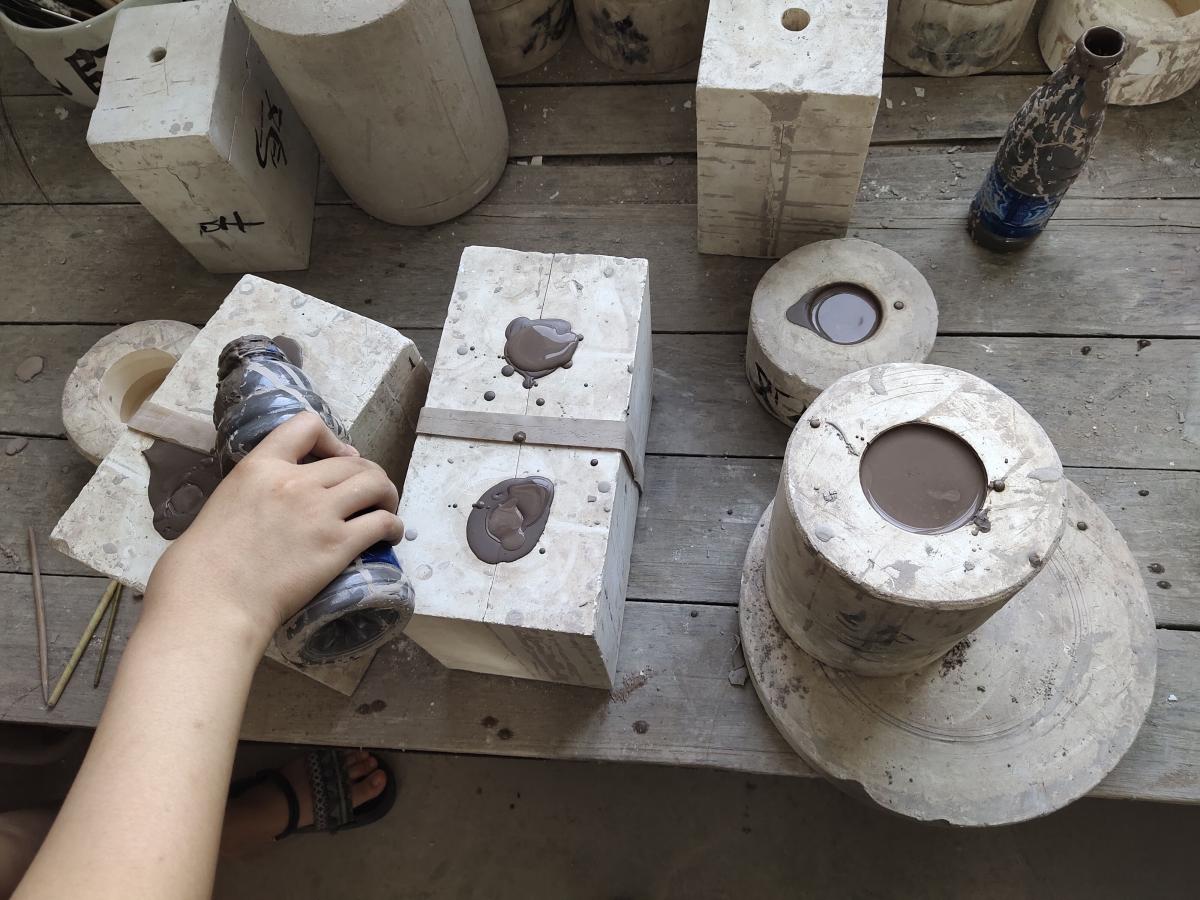 吃罢早饭,虽然天气潮湿闷热,但同学们的热情仍与温度保持一致,没有了师傅在一旁的示范指导,来到工作室的大家明显一阵紧张无措。稍事安定后,队长开始帮着大家理清思路,并率先拿起搅拌器将经过一夜沉淀的泥浆重新打匀。接下来同学们分分行动起来,组织分工,一部分同学把打好的泥浆分装进容器里,另一部分同学开始检查模具,一切准备就绪后,同学们分别开始依次将泥浆倒进模具。
