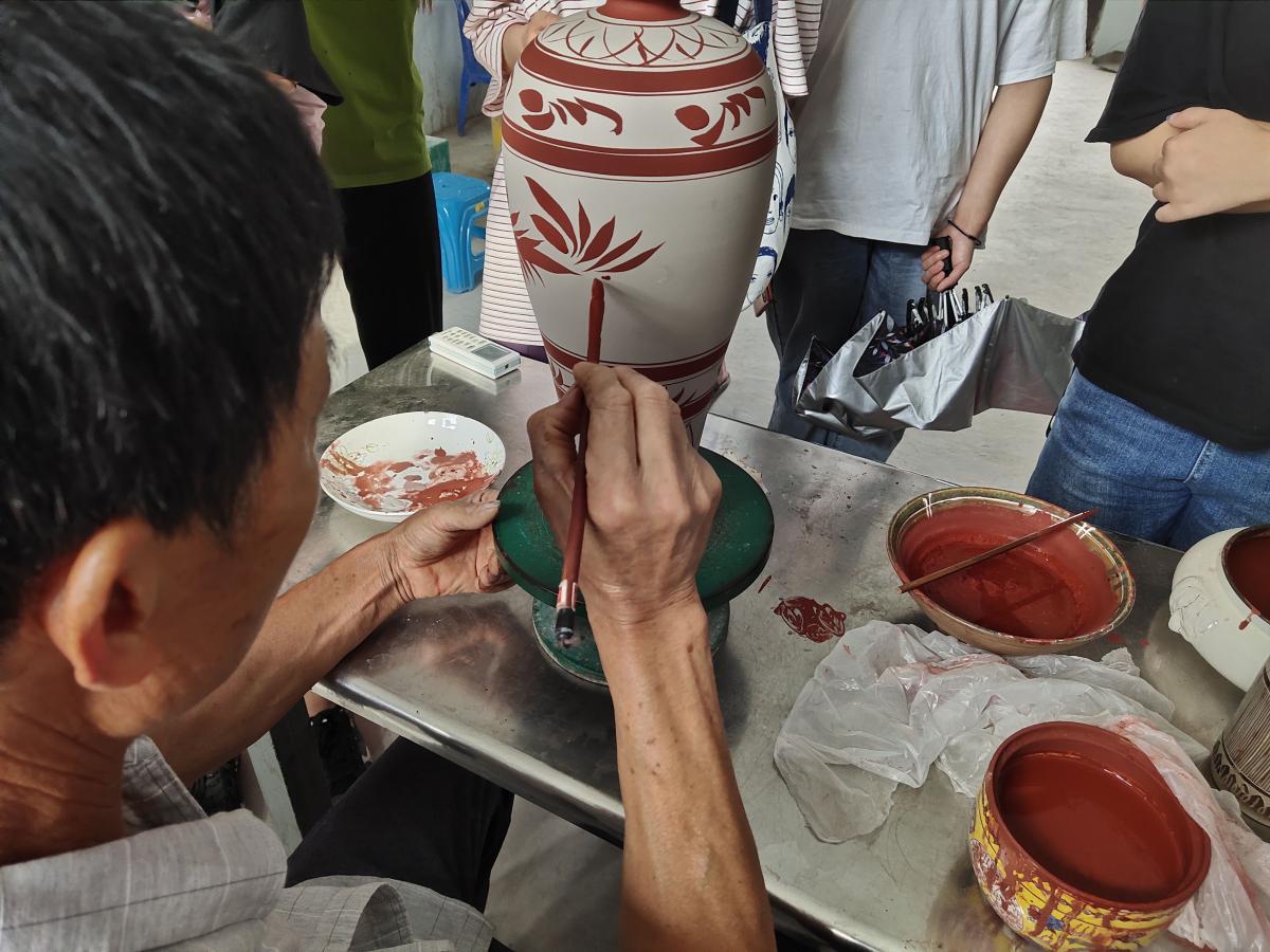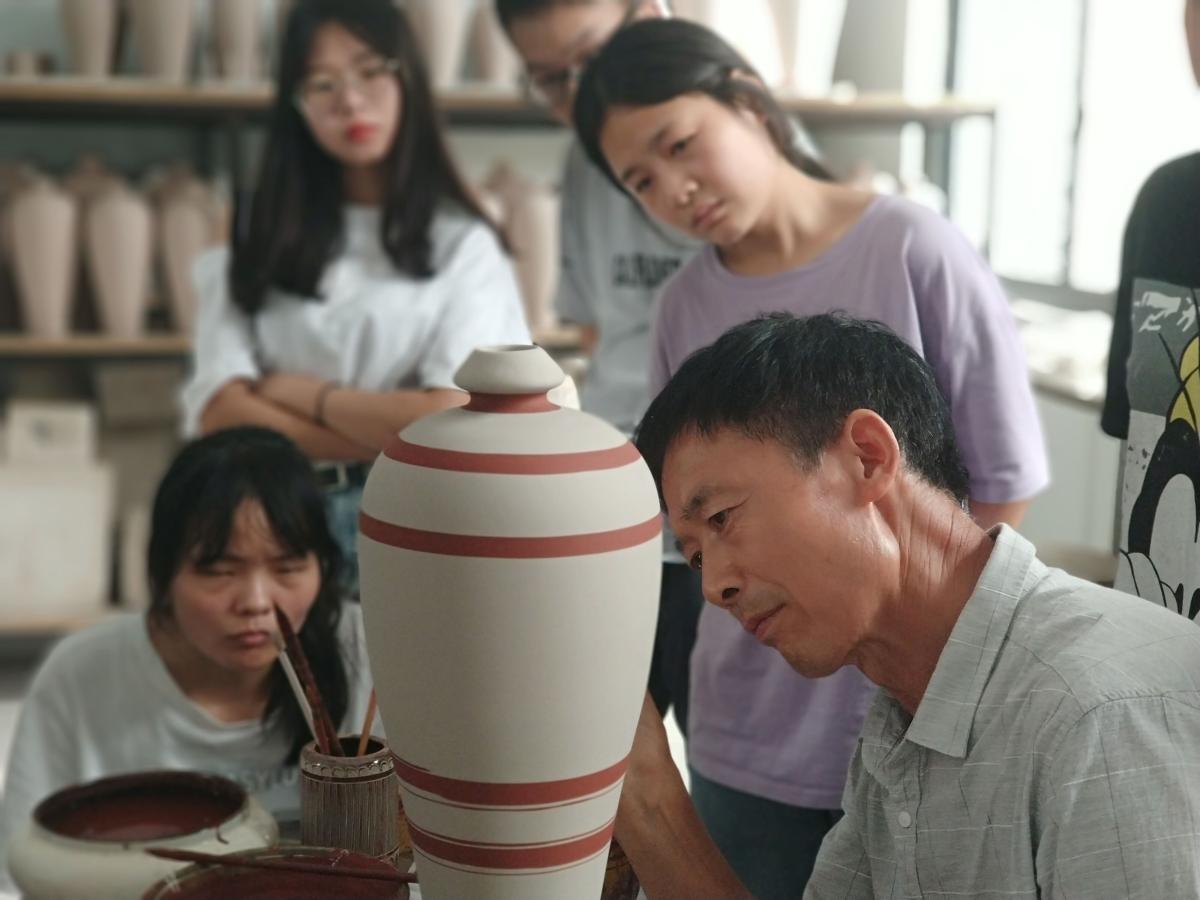 7月7日,美术学院暑期扒村社会实践队学生们早早地来到了扒村窑瓷器研究所。今天的活动是看陶瓷师傅画瓷瓶,以学习经验为主,同时也是为了接下来工作做准备。