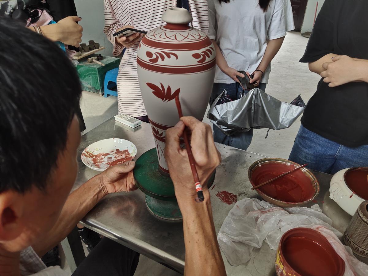 各位实践队员们看宋乾军师傅一手转着转盘,一手执笔在泥瓶上作画,动作流畅自然、一气呵成,不由得连声称赞。同学们都说,从师傅这里学到了不少的技巧,期待着明天自己能够大显身手。