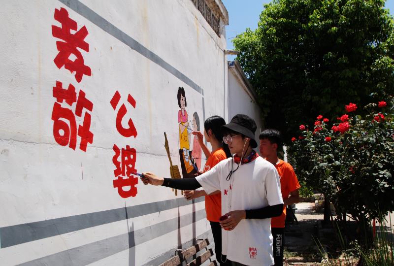 烈日当头,实践队学生们却没有受到丝毫的影响。定稿、起形、上色、调整······一切工作进行的如火如荼。村中老人带着孩子来到学生们的身边,对孩子说:“这是孝字,孝顺的孝,”,牙牙学语的孩子也咿呀咿呀的说着“孝”。傍晚,村中的墙壁上一幅幅图画、文字诉说着中华传承了几千年的孝道美德。