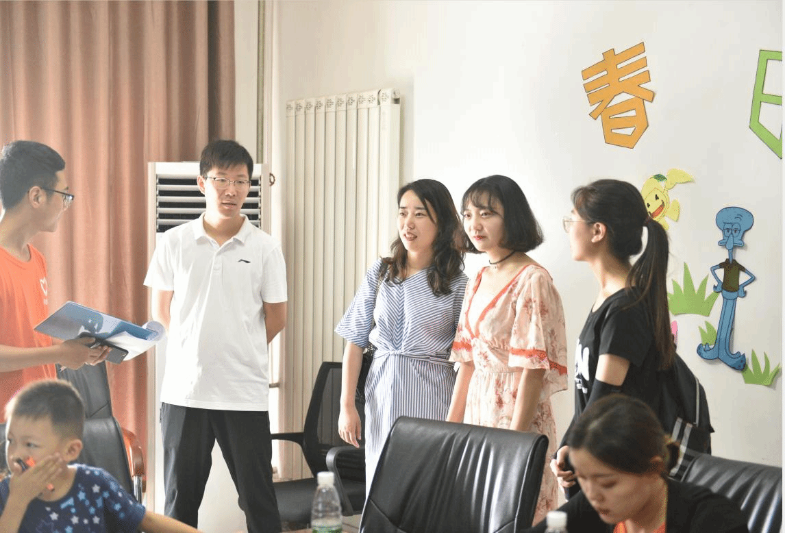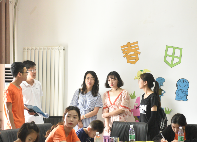 7月11日,实践队的队员们在楼下迎接到自己的小朋友,带领大家来到艺术楼422会议室,开始了第十天的课程。上午,许昌学院校团委社会实践检查组的老师来到春田花花的授课教室,检查指导实践队实践活动的进展情况。