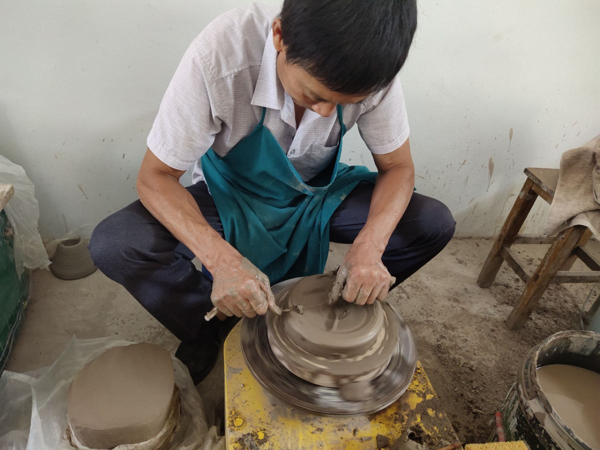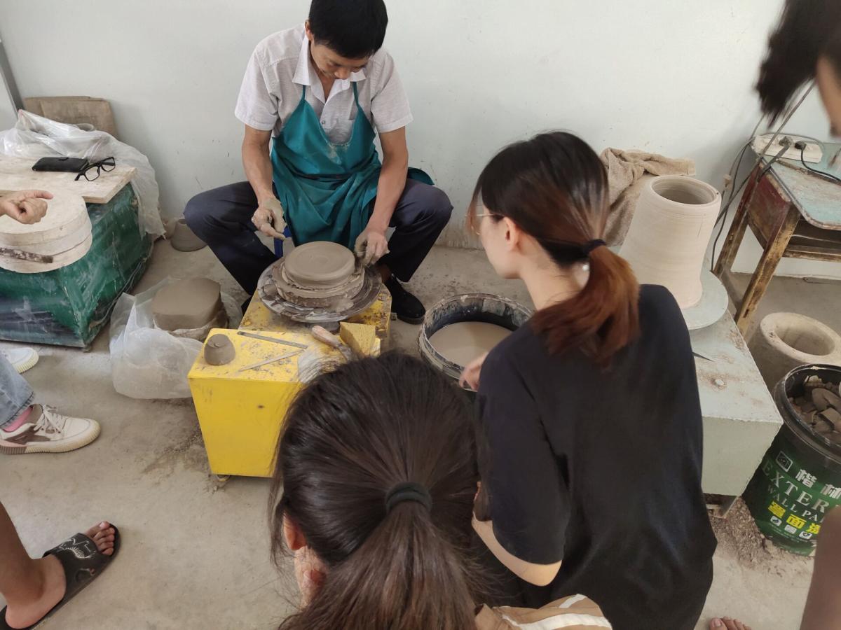 7月10号,美术学院暑期扒村实践队的学生们开始了第十天的实践活动。实践队学生们今天要观看师傅完成瓷器制作流程中的“拉胚”这一工序,主要是以拉盘子为主,以便于同学们后期画盘时使用。