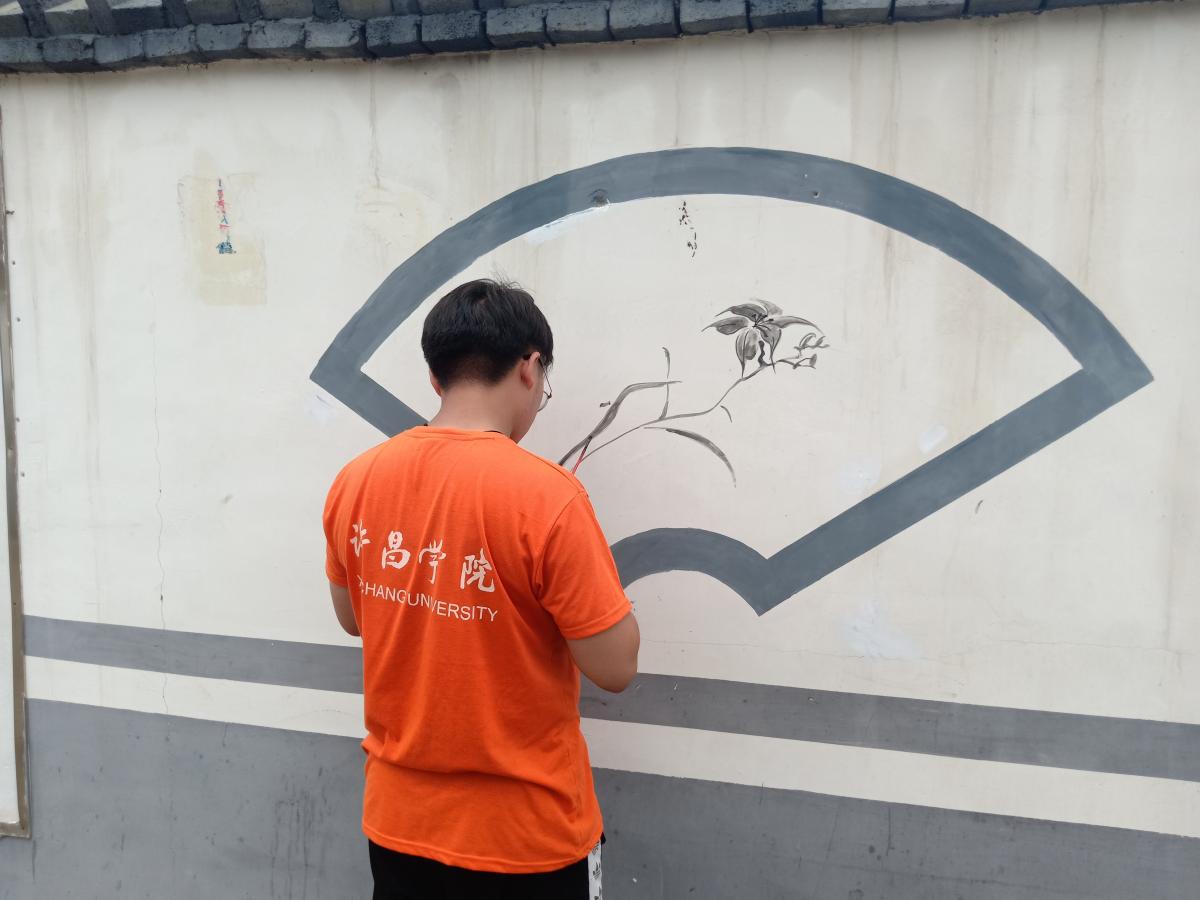 实践队学生在赵鹏飞老师的带领下于6点到达马庄村,马庄村群山环绕、树木繁茂,风景宜人。实践队学生们讨论交流后决定为马庄村绘制装饰墙画,绘画方式定为中国画。在简单的分工后,同学们迅速投入到了工作中,起型、勾线、上色、浸染一气呵成。在一天的努力后,奔腾骏马、傲骨寒梅、刚毅山石、池莲等栩栩如生的图案出现在了墙面上。一开始,村民对实践队学生们的绘画水平还抱有一丝怀疑,但看到完成图后都赞不绝口。