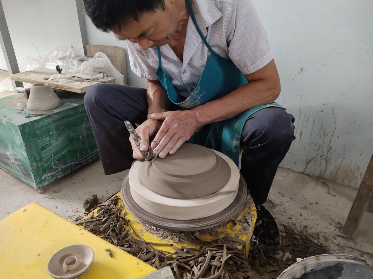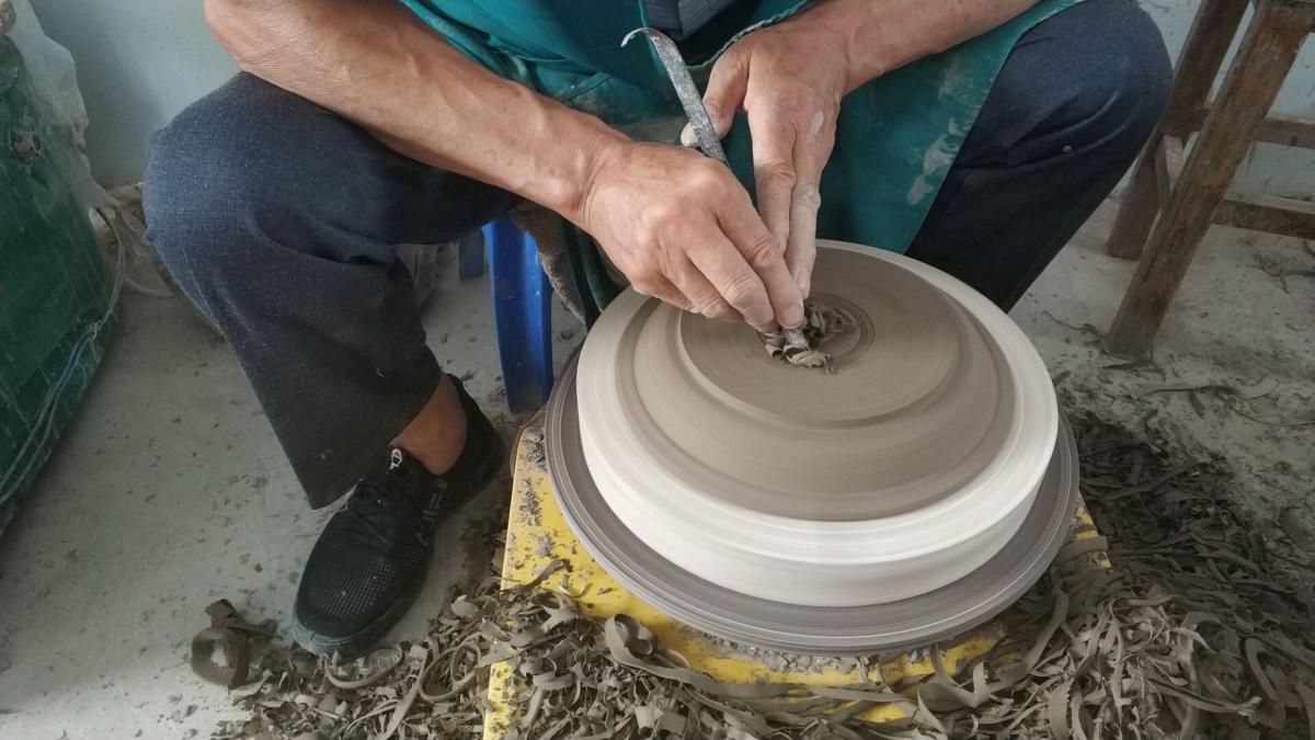 经过前一天的忙碌准备,宋乾军师傅与其他几位师傅要将昨日拉好晾干成型的盘坯进行进一步的调整塑型,也就是修胚。与拉胚不同,修胚的手法虽然简单却不易操作,是一件瓷器最后成型是否完美匀称的关键。快速旋转的拉胚机上,盘坯置于正中央,随着师傅手上刮刀的均匀下力,一圈圈泥条也随之飞旋下来,而盘坯也慢慢呈现出更加完美的形状。