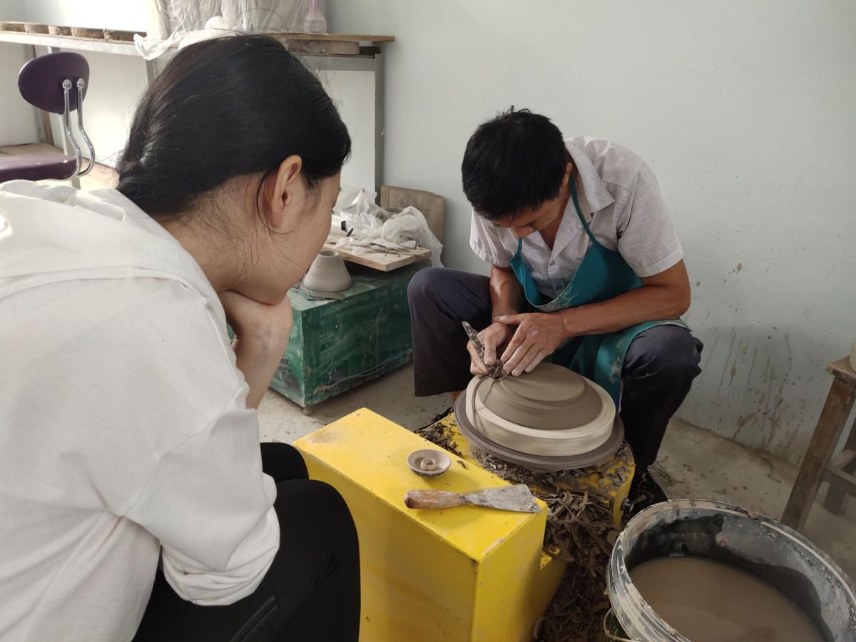 由于修胚的操作难度太高,师傅并没有让学生尝试,而是让大家学习拉胚。学生们分好小组各自围坐在自己的拉胚机前开始尝试“掌控”那一团团不起眼的泥巴。那些看起来在老师傅手下“乖巧听话”的泥团到了学生们的手里却显得格外“调皮”,有的甚至还擅自“跑”下机器,“跳”进了学生们的怀里。即使如此,学生们也没有丧气。一段时间的磨合之后,终于有学生拉出了模样来。