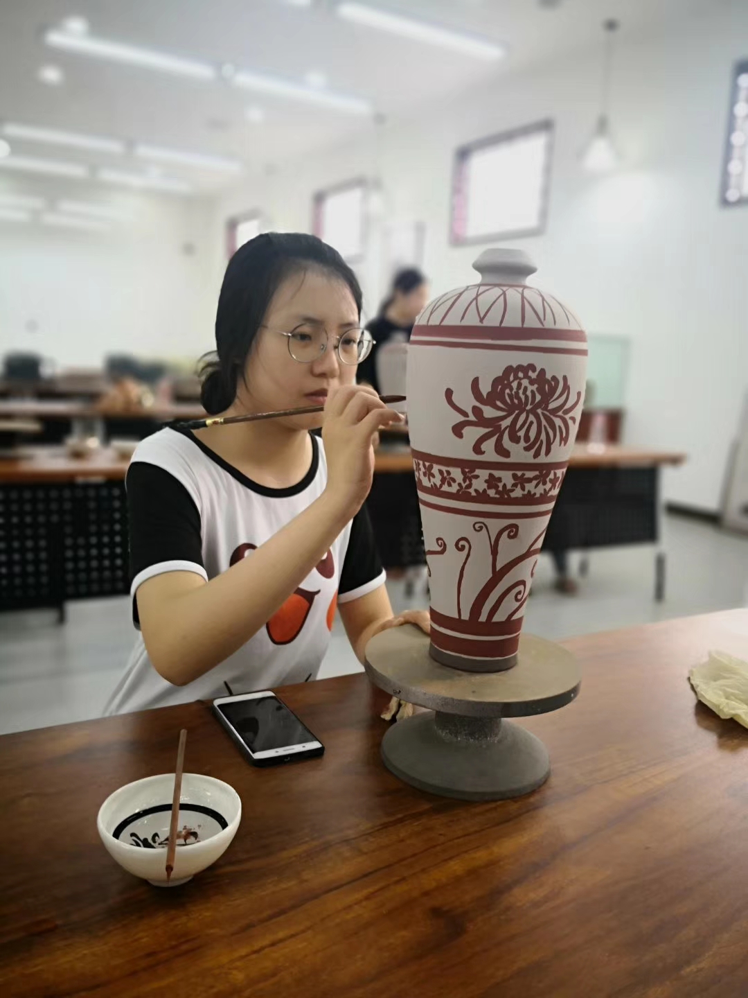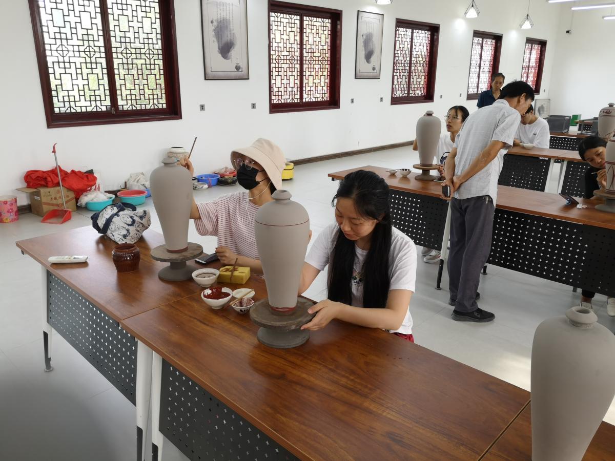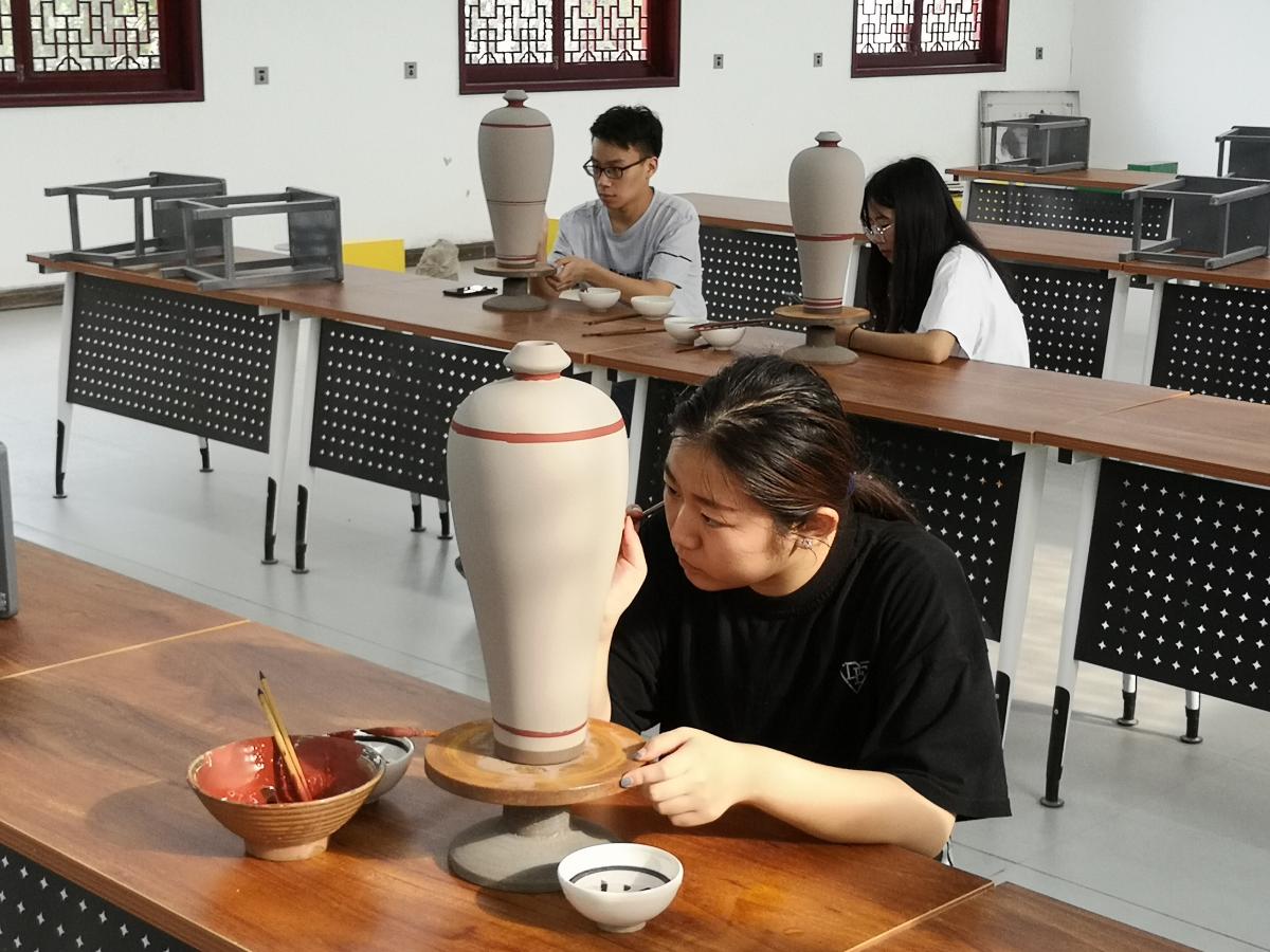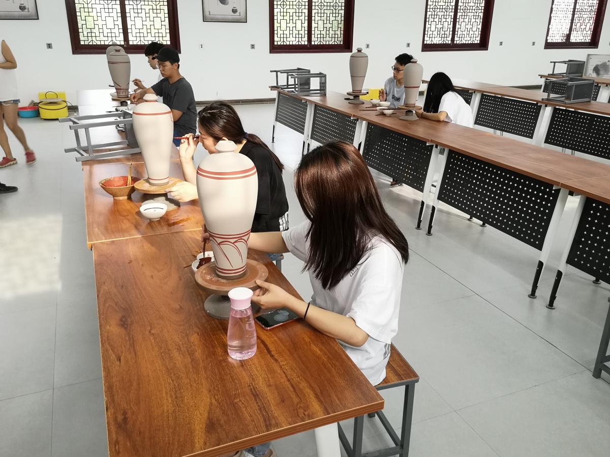 7月8日,美术学院暑期扒村社会实践队学生们早早地来到了扒村窑瓷器研究所,今天活动的主要内容是画花瓶泥坯。经过昨天对瓷瓶纹样的了解和尝试,学生们看起来个个都信心满满。