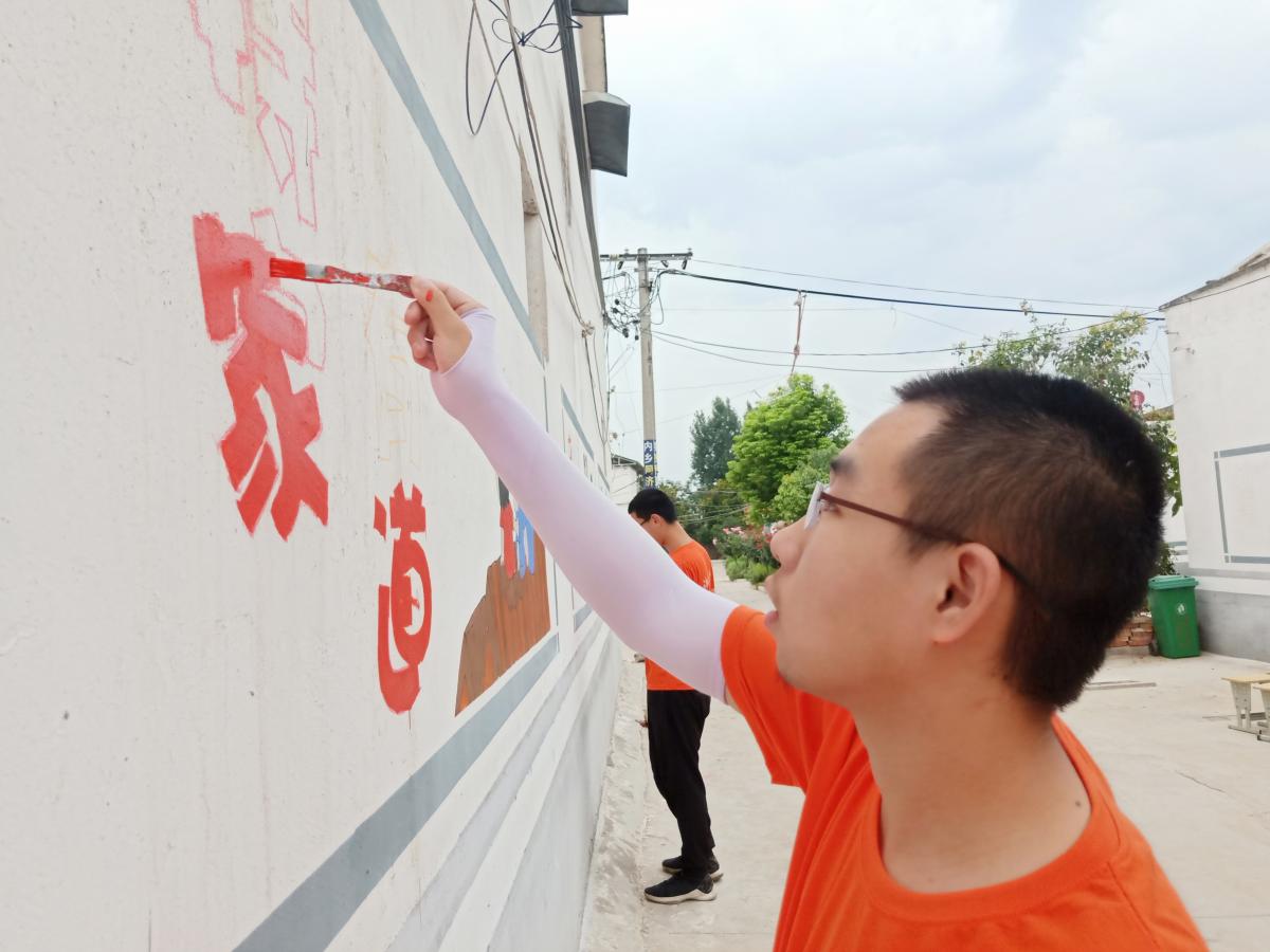 实践队学生在赵鹏飞老师的带领下于早晨6点到达谢庄,在经过简单的分工后,学生们迅速投入到了工作中,战高温、斗酷暑,力争绘制出有特色、有高度、有内涵的主题文化墙。“只要投入进去就感觉不到累,而且这过程很享受,心里只想着把它画好。”正在参与墙绘工作的易昌同学说到。