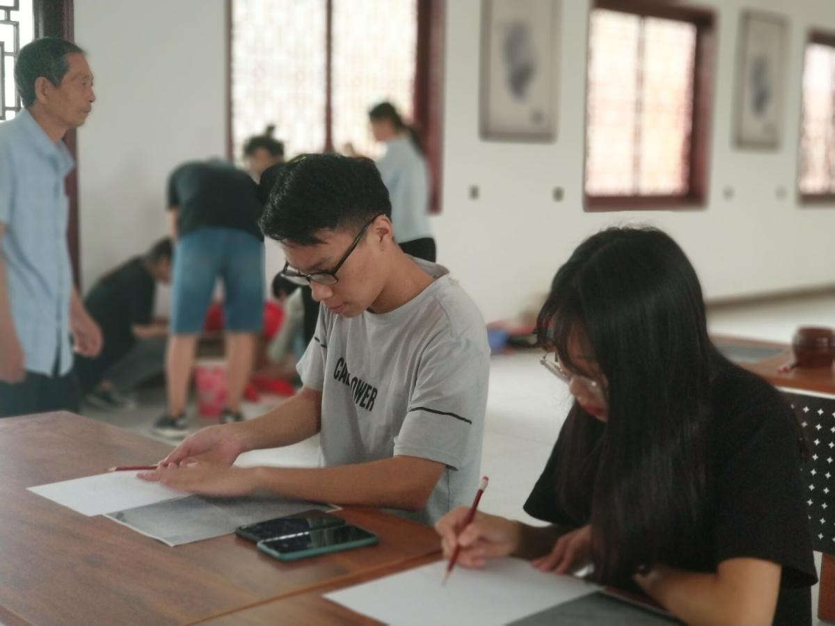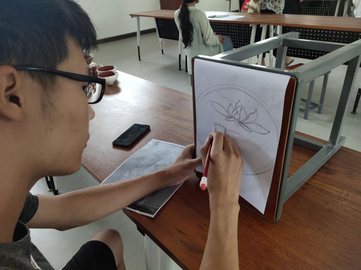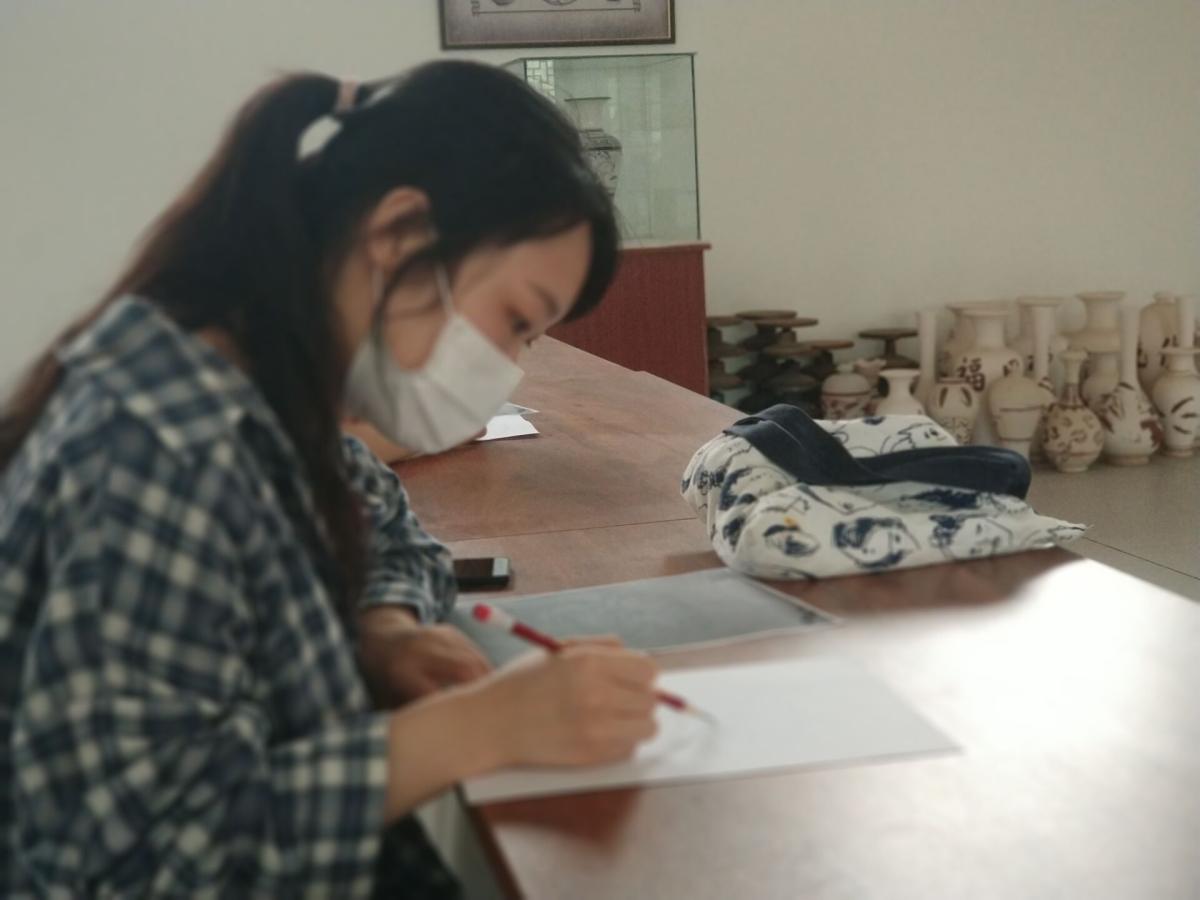 7月13日,一大早美术学院暑假扒村社会实践队学生们就与席家窑坊的席军晓会长来到了瓷墨轩工作室。工作室中准备好了纸和笔,今天学生们的主要任务是练习画稿,为明天的瓷盘画做准备。