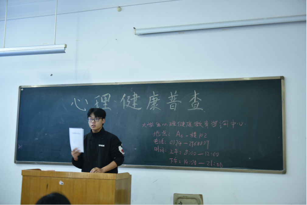 开考前,大家携带纸笔准时进入教室准备测试。紧接着,许昌学院心理教育与咨询中心的两名指导人员进入教室分发答题手册并宣读指导语。此次普查以“心理精神状况调查册”为审查工具,需要同学们依次完成手册上的每一道题并自行计算答题得分,以便后续专业人员对学生们的得分进行结果分析。测试过程中,同学们态度认真,实事求是的填写了资料及问卷,心理普查考试圆满完成。