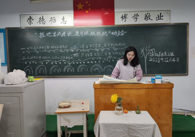 2019年12月16日,美术学院于艺术楼112教室召开加强基础文明建设、促进本科教学评估学生动员大会,大会由温甜老师主持,美术学院全体学生参加。
