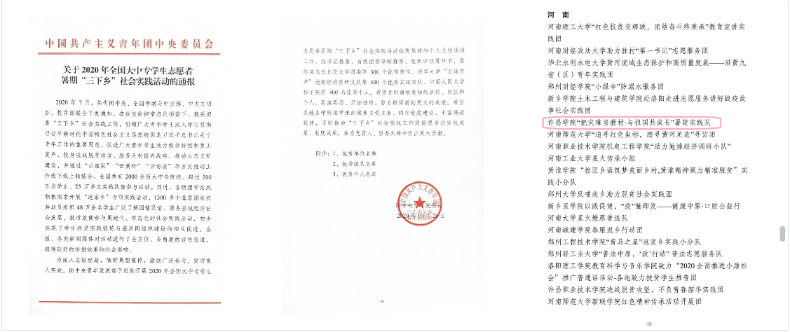 近日,共青团中央发布《关于2020年全国大中专学生志愿者暑期“三下乡”社会实践活动的通报》,我院“把灾难当教材·与祖国共成长”暑期实践队获得2020年全国大中专学生志愿者暑期“三下乡”社会实践活动优秀团队称号。