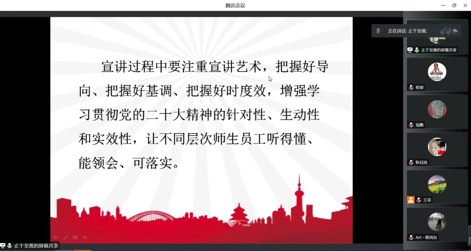 最后,张利书记就学习宣传贯彻党的二十大精神提出具体要求:一是全面开展学习宣传,组织开展覆盖全体教职工生的学习宣传教育活动,教育引导干部师生深刻认识把握党的二十大的重大意义,切实把思想和行动统一到党中央部署要求上来。二是有效组织集中宣讲,院领导班子、科级以上干部和辅导员要深入学生中间,根据新时代大学生思维方式、认知水平等,采用灵活有效、线上线下的多种形式开展党的二十大精神宣讲,以讲促学,以学促干。三是精心做好新闻宣传,充分利用校园网、新媒体、宣传橱窗等等各类校园媒体和宣传阵地,做好新闻宣传工作,展现我院党员干部和师生员工学习典型事迹和良好风貌,为学习宣传党的二十大精神落实落地营造良好氛围。四是注意学习转化,要将党的二十大精神贯彻落实到学校“十四五”各项发展事业之中,引导激励广大干部师生坚定信心、振奋精神,以自觉躬身入局的使命担当深入贯彻落实党的二十大精神,推进我院教育教学、科研及各项工作的高质量发展。