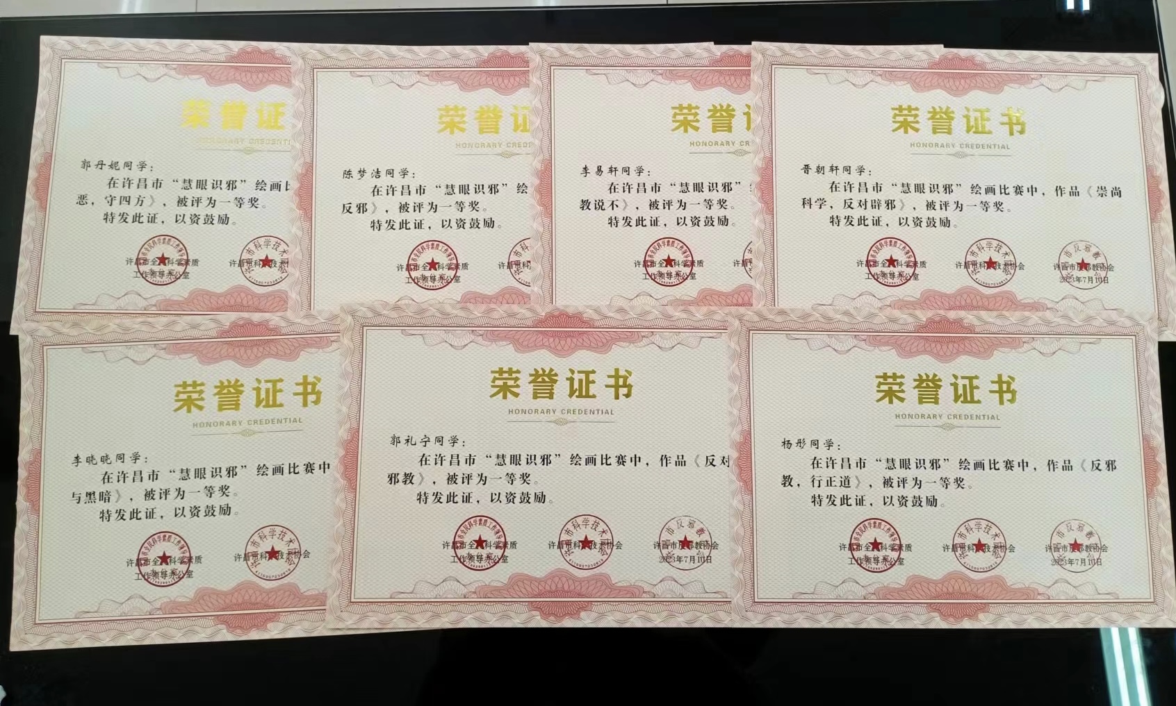 近日,由许昌市全民科学素质工作领导小组办公室、许昌市科协、许昌市反邪教协会联合开展的许昌市“慧眼识邪”绘画比赛落下帷幕。我院李晓晓、晋朝轩、杨彤、郭礼宁、郭丹妮、陈梦洁、李易轩等同学获得一等奖7项,萧斐斐、张婷婷、尤淑雅、秦梦琪等同学获得二等奖13项。李敏、胡一铭、何淑芳、桓坡老师获得优秀辅导教师奖。