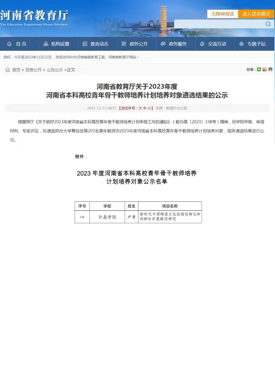 近日,根据河南省教育厅《关于做好2023年度河南省本科高校青年骨干教师培养计划申报工作的通知》(教办高〔2023〕338号)精神,经个人申报、学院推荐、学校申报、审阅材料、专家评议,2023年度河南省本科高校青年骨干教师培养计划培养对象评选结果揭晓,我院教师卢青遴选为培养计划培养对象。