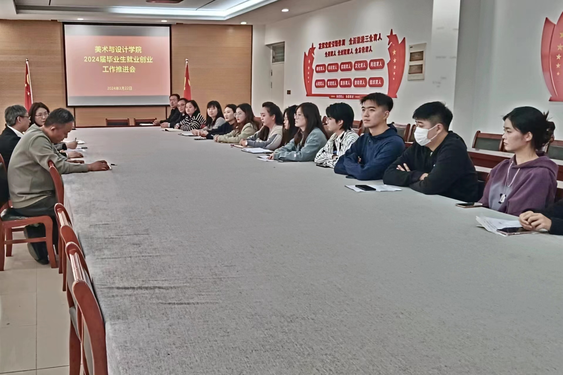 3月22日下午,我院在艺术楼三楼会议室召开2024届毕业生就业创业工作推进会,院领导班子、各系室负责人、党支部书记、就业专干、全体辅导员及毕业班学生代表参加会议。会议由副院长韩鸿友主持。