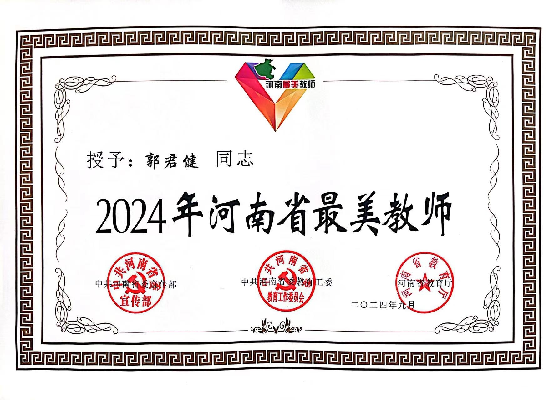 近日,省委宣传部、省教育厅下发《关于公布2024年河南省最美教师的通知》(豫教师〔2024〕229号),我院教师郭君健成功入选。
