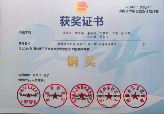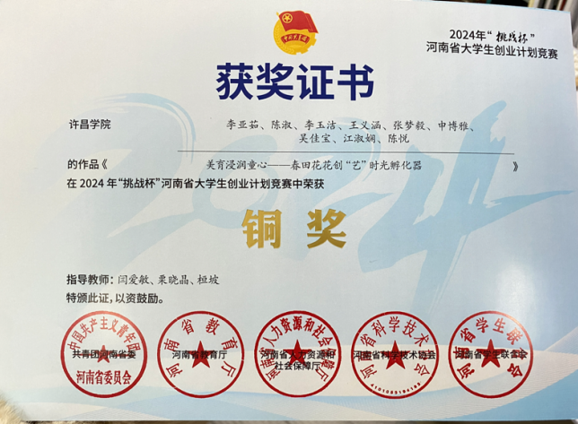 日前,由共青团河南省委、河南省教育厅、河南省人力资源和社会保障厅、河南省科学技术协会、河南省学生联合会联合主办的2024年“挑战杯”河南省大学生创业计划竞赛公布了获奖名单,我院荣获铜奖2项。