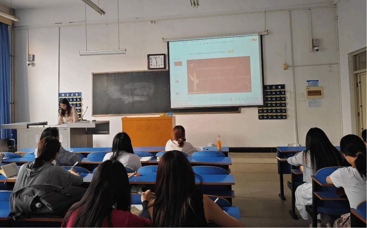5月28日,我院于艺术楼204教室组织开展《让改革创新成为青春远航的动力--深入学习贯彻党的二十届三中全会精神》的主题团课,此次团课由贺宁老师主讲,她老师带团员青年们学习了党的二十届三中全会精神,并要求同学们进一步增强政治自觉、思想自觉和行动自觉,做新时代优秀团员。