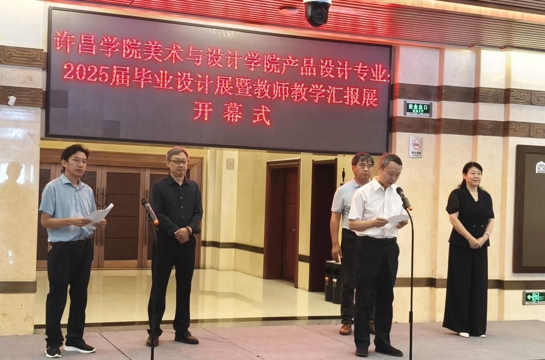 许昌学院美术与设计学院产品设计专业2025 届毕业设计展暨课程思政教学成果展,于6月20日——8月20日在底蕴深厚的禹州市博物馆正式拉开帷幕。许昌学院副校长杜根远、许昌市钧瓷产业发展服务中心张金伟、美术与设计学院院长张少华、禹州市文广新局副局长贾韶霞、禹州市博物馆馆长苏朝阳、省级工艺美术大师刘红生、刘志军、孙水娟等和美术与设计学院产品设计专业师生参加了此次开幕式。