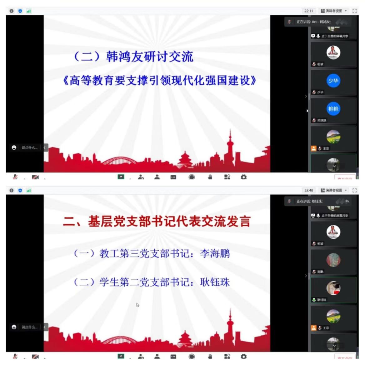 会上,党委书记张利以《宏伟蓝图催人奋进,建功时代踔厉奋发》为主题、副院长韩鸿友以《高等教育要支撑现代化强国建设》为主题,分别报告学习党的二十大精神的心得体会,教工党支部书记代表李海鹏、耿钰珠进行交流发言。