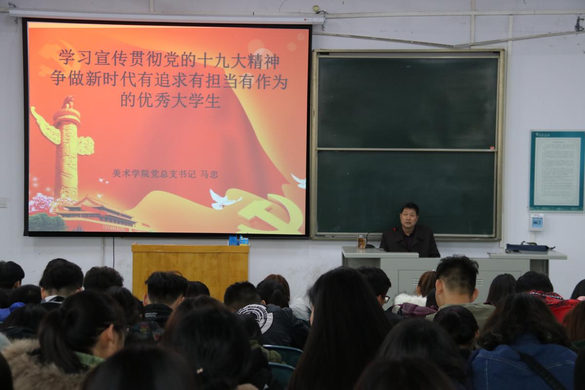 11月17日下午,美术学院党总支书记马忠以《学习宣传贯彻十九大精神,争做新时代有追求有担当有作为的优秀大学生》为题,为全体学生党员、入党积极分子和部分学生代表上党课,集中学习宣传党的十九大精神。