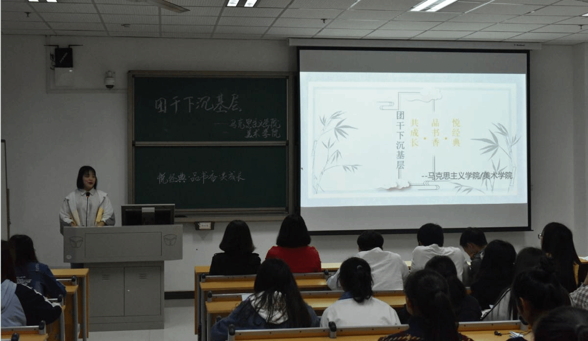 2019年4月29日晚,美术学院和马克思主义学院在文科综合楼306开展以“悦经典·品书香·共成长”为主题的团干下沉基层活动。此次活动由美术学院和马克思主义学院的团员,团干部共同参加,马克思主义学院组织部蒋鑫宇同学主持。