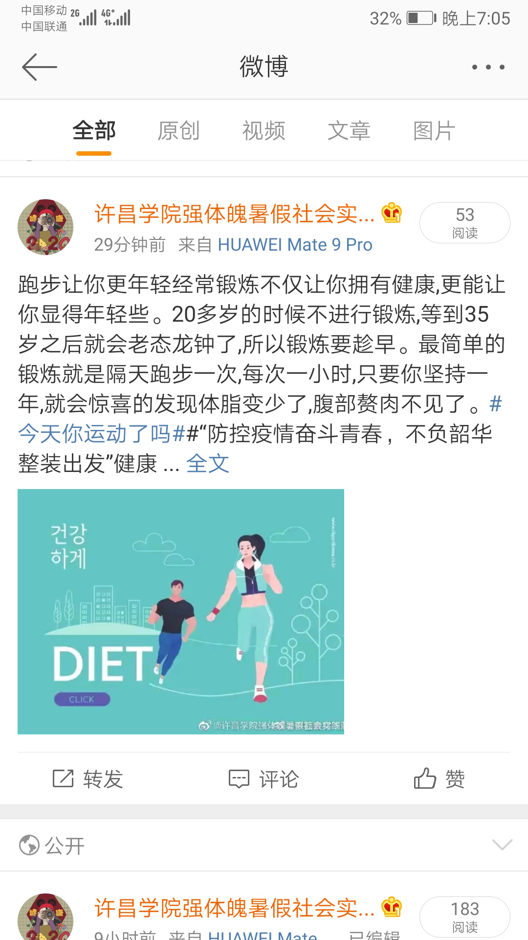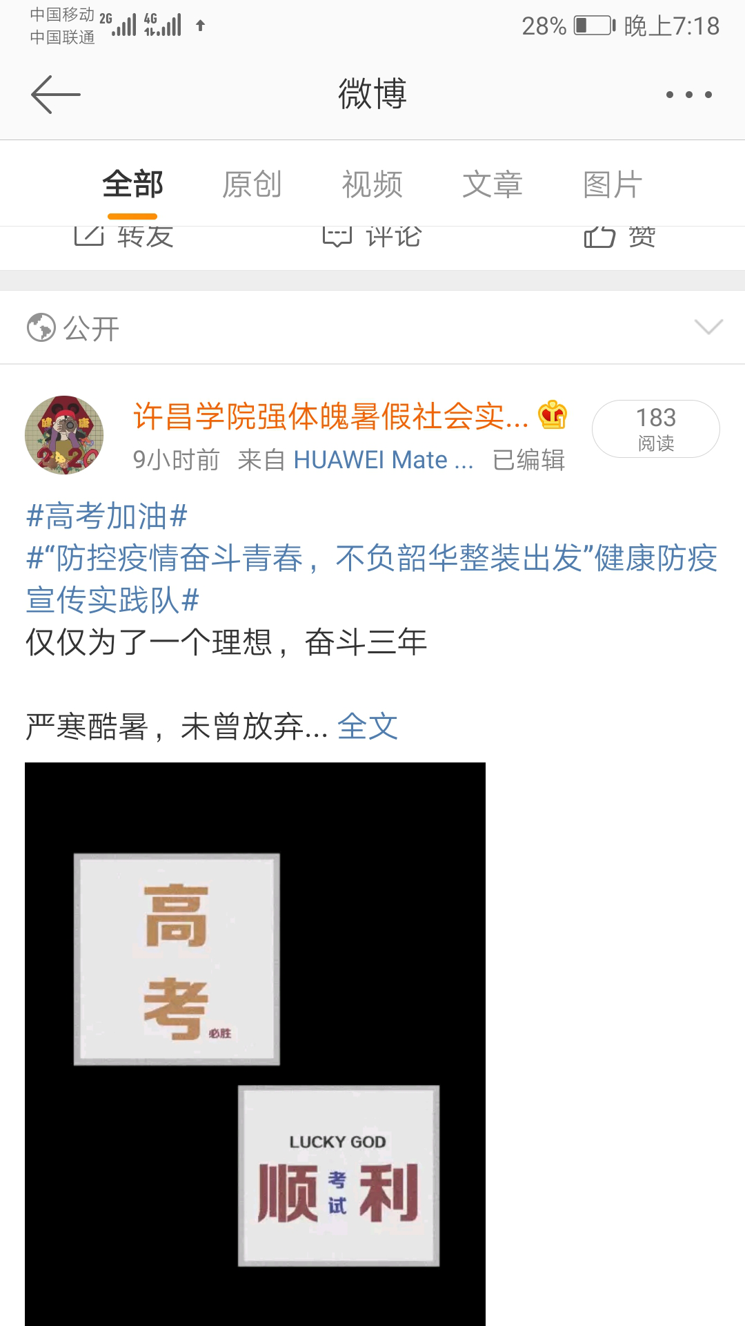 通过昨天开会各个小组组长对这段时间组内工作的总结和队长对整体工作的总结,通过大家的讨论提出了接下来的工作如何改进,怎么能更寒的完成接下来的社会实践。我们的宣传方向是健身、心理健康和科学防疫三个方面,在这段时间的工作中主要是科学防疫做的比较多,其他两个方面较少,在剩下的时间里要多做一些关于健身和心理健康方面的宣传,以及一些实时新闻。根据这些,今天材料组查找的主要内容是为高考加油,高考应该怎样心理调节;七七事变83周年;运动健身小常识以及运动的黄金时间;6月11日以来新冠肺炎确诊病例情况;贵州安顺一载有学生大巴车冲进水库经核实,发生事故的车辆是当地的2路公交车,确定有高考学生在车内,受省委书记、省人大常委会主任孙志刚委托,省委副书记、省长谌贻琴正赶赴事发地组织开展救援,还有一些现场视频。宣传组对这些材料整理编辑在微博发布,也会在微博发布一些关于高考的自制采访小视频。