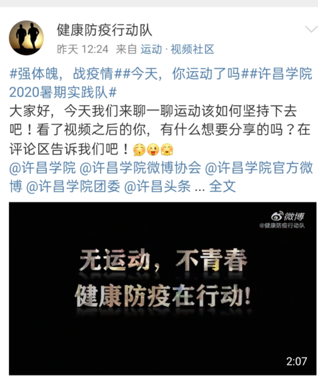 实践活动采用线上推广与线下实践想结合的形式,实践队不仅每天充分利用微博,抖音等平台进行实践推广,也积极的投身于各种运动实践项目中去,团队成员在实践中发掘自身感受,将运动中需要注意的安全事项、健康饮食采用微博推文的形式记录下来,利用网络平台让更多人了解这些知识。视频剪辑也在不断的创新形式,增强内容的趣味性、创新性,让更多人愿意观看,想要去运动实践。