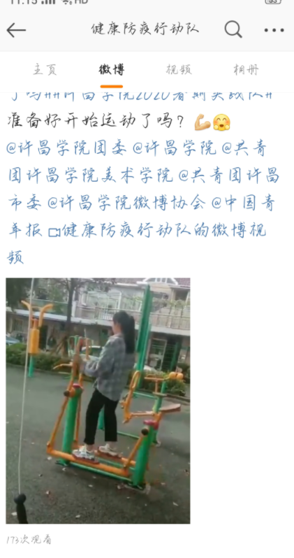 自2020年7月始,许昌学院美术与设计学院的“强体魄抗疫情,不负韶华梦青春”健康防疫行动队开展的一系列活动已接近尾声了,我们这次采取了线上线下相结合的方式让大家参与到健身。利用微博,抖音,QQ等社交软件向大家宣传加强体育锻炼的益处。