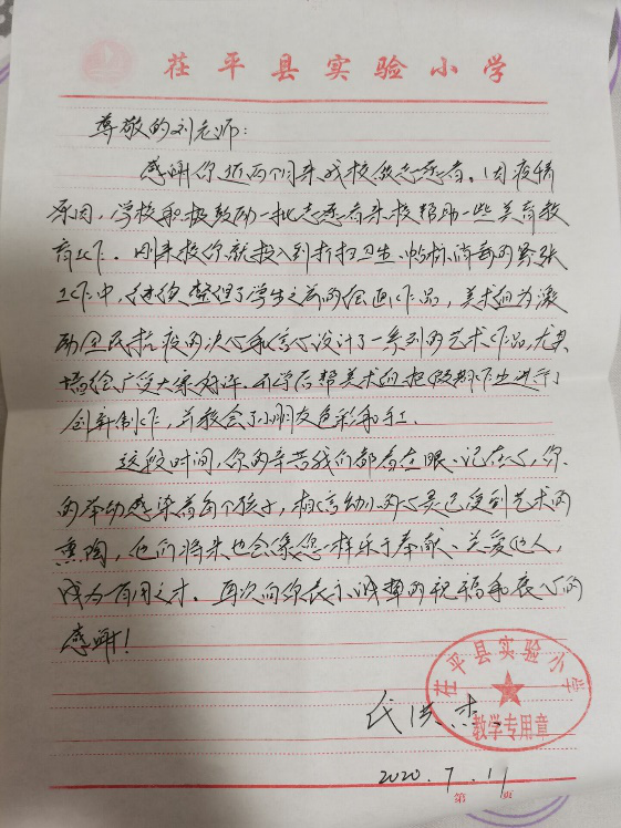 许昌学院美术与设计学院“弘扬家乡新风尚,描绘美丽新农村”社会实践队的队员们已经在茌平县实验小学社会实践了半个月,为表达对社会实践队员们的感谢,茌平县实验小学的代主任写给了全体社会队员们一封感谢信,并给每一位队员留下了鼓励的话语,这是对所有队员的极大的鼓励。