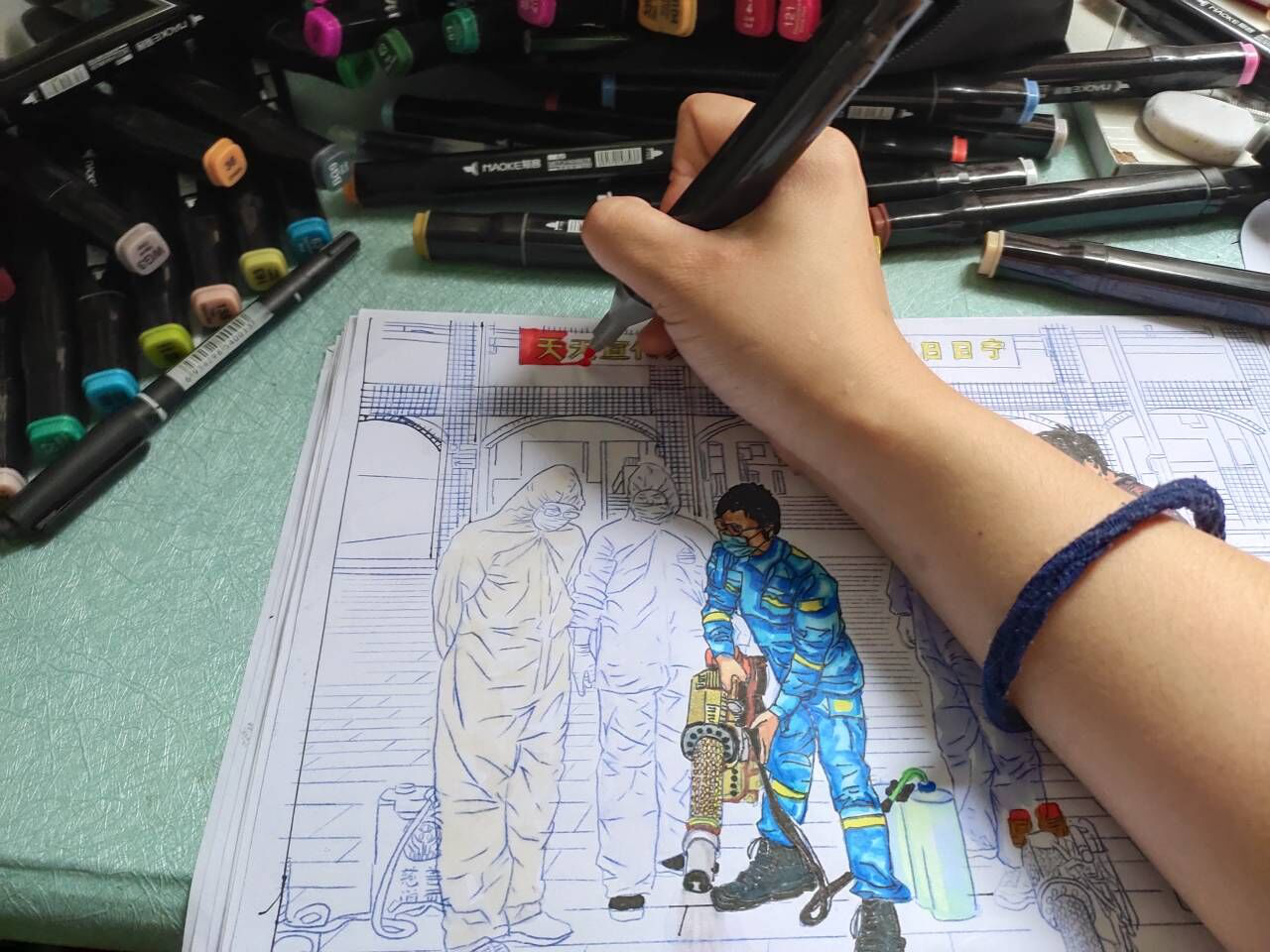 而有一些队员则根据自己的所见所闻、所感所悟,绘制出了许多精美的绘画作品。不少队员们以疫情期间留下的照片作为参考,描绘了人们从货车上搬下物资、身着防护服的工作人员为学校教室消毒、坚守在执勤哨卡的民警为百姓耐心解答问题、医护人员向痊愈出院的病人挥手告别等多个场景,水彩、素描、速写、版画······虽然大家运用的绘画手法各不相同,却同样表达出大家对疫情期间坚守工作岗位的工作者的敬佩之情。实践队还举办了优秀画作的线上展览,细腻的笔触,精湛的画技,一幅幅画作因为饱蘸着大家的感动与爱,展现出了强大的感染力和生命力。