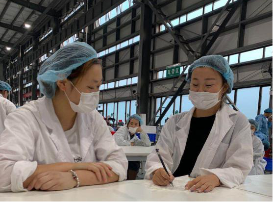 谭琼同学在采访家乡社区服务人员 郭雅欣同学在为口罩厂工人进行宣讲活动