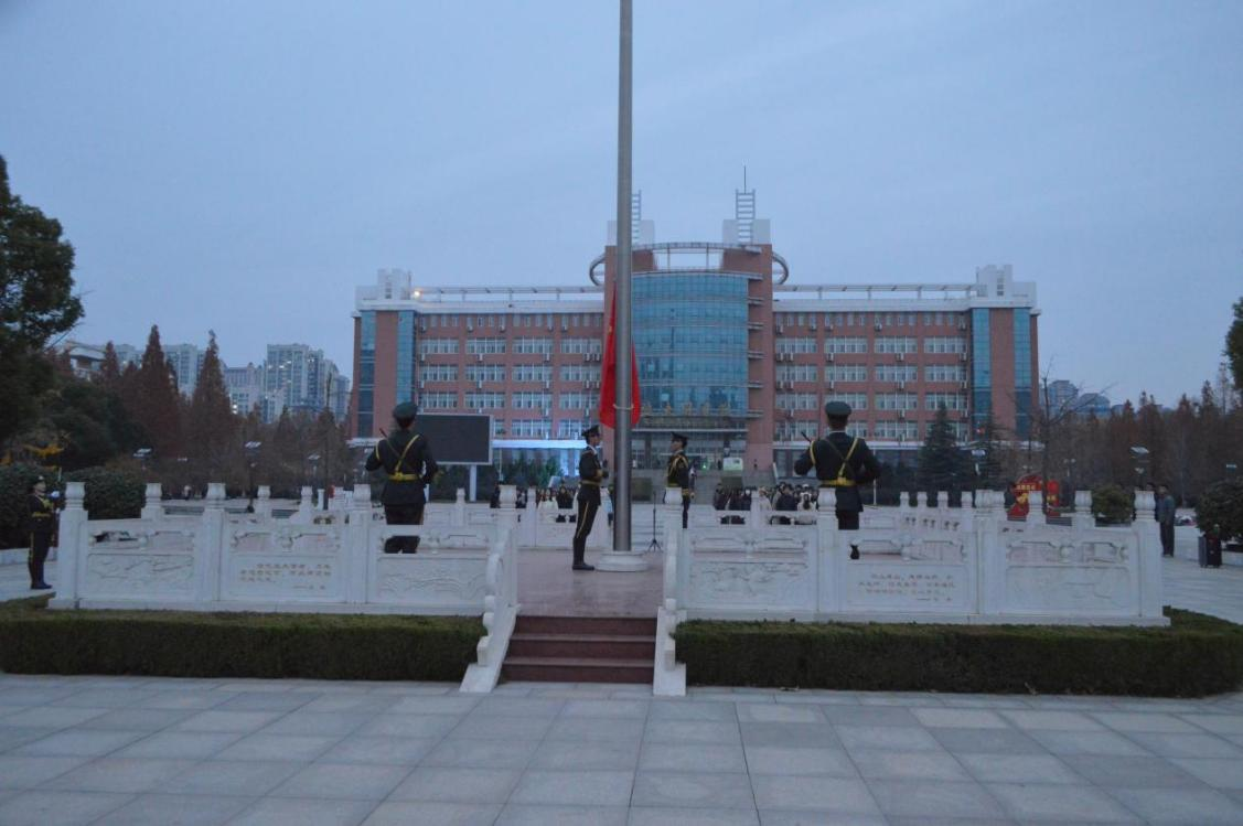 7时整,国旗护卫队迈着铿锵有力的步伐,护旗入场。全体师生庄严肃立,齐唱国歌,五星红旗冉冉升起。