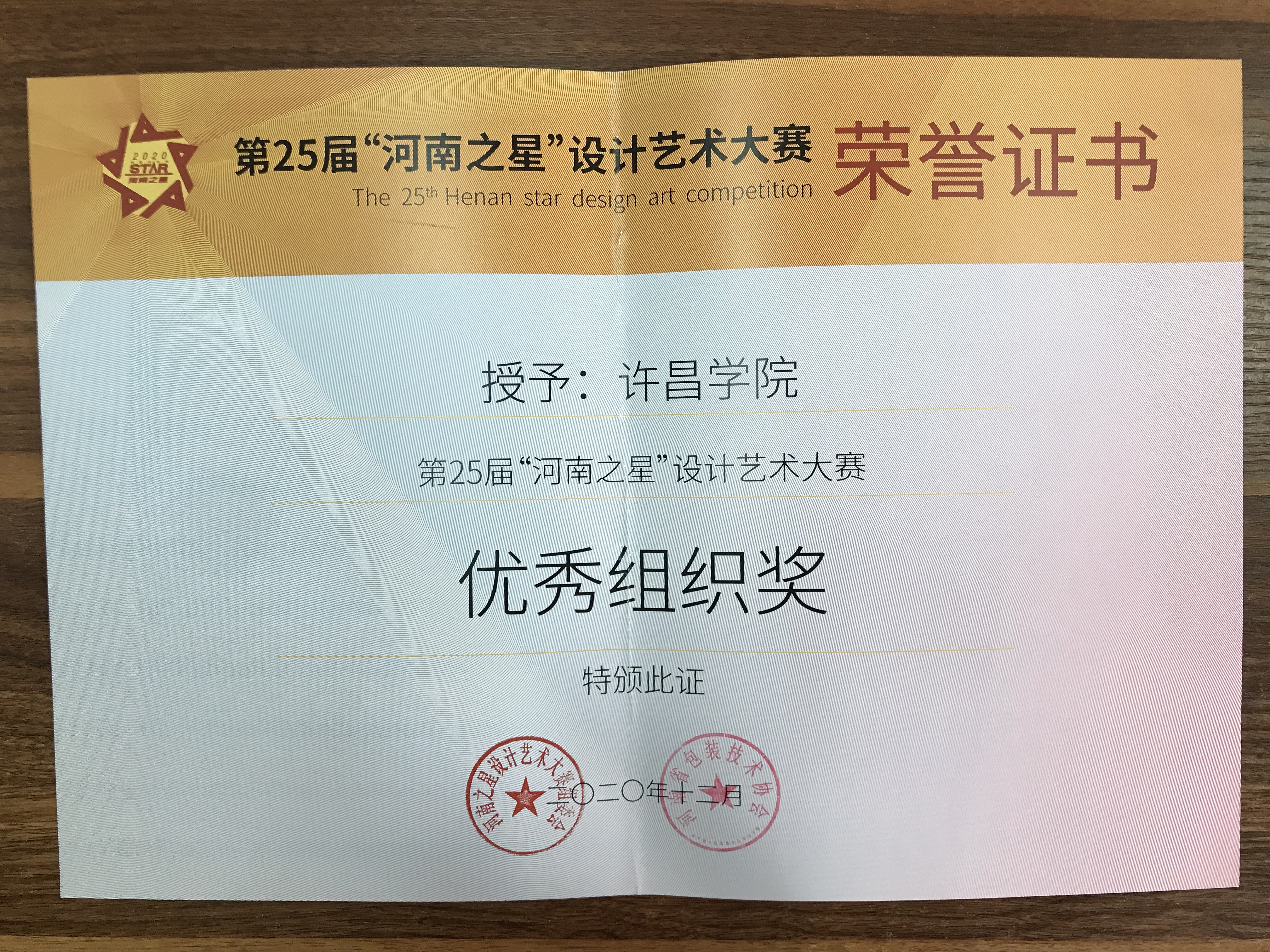 由河南省包装技术协会主办,河南省包装技术协会设计委员会、河南大学美术学院承办举办的第25届“河南之星”设计艺术大赛中,我院师生成绩突出,其中银奖2项、铜奖3项,优秀奖3项,优秀指导教师2名,并荣获“优秀组织奖”。