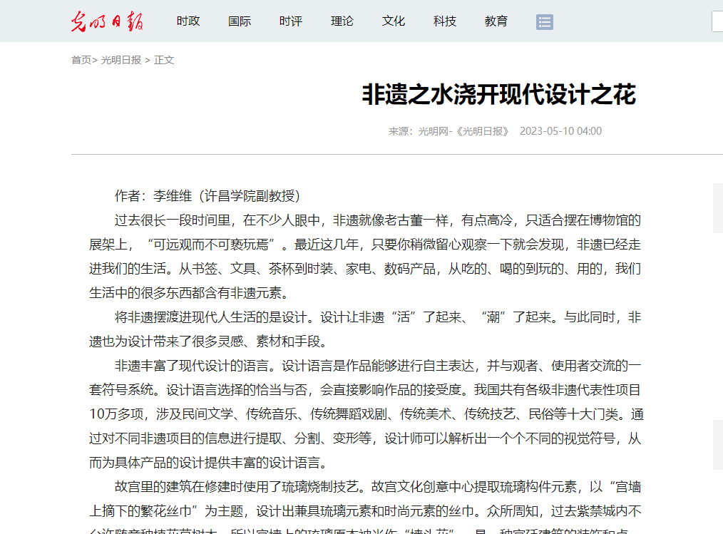 我院教师李维维在(《光明日报》2023年05月10日)文艺评论版发表理论文章《非遗之水浇开现代设计之花》,该文讨论了非物质文化遗产与当代设计的关系,阐释了设计作为文化重构的重要方式,立足本民族优秀文化,是设计创新转化的必要途径,也是讲好中国故事,弘扬中国文化特色,建立起全球化传播格局的重中之重。