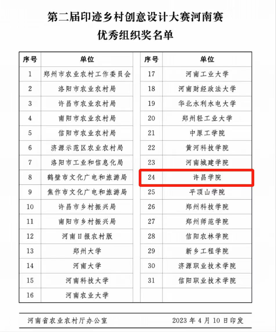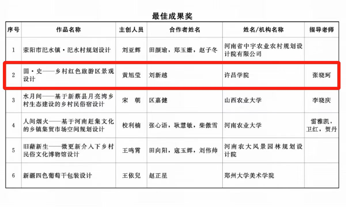 近日,由河南省农业农村厅、河南省工业和信息化厅、河南省文化和旅游厅、河南省乡村振兴局和河南日报社联合举办的第二届“印迹乡村”创意设计大赛河南赛中,我院张晓珂老师指导的黄旭莹、刘新越两名学生参赛的作品《固·史——乡村红色旅游区景观设计》荣获得最佳成果奖,我校并荣获“优秀组织奖”。