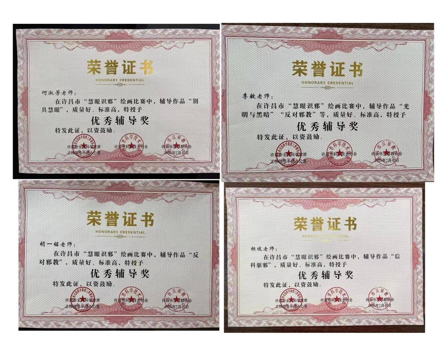 近日,由许昌市全民科学素质工作领导小组办公室、许昌市科协、许昌市反邪教协会联合开展的许昌市“慧眼识邪”绘画比赛落下帷幕。我院李晓晓、晋朝轩、杨彤、郭礼宁、郭丹妮、陈梦洁、李易轩等同学获得一等奖7项,萧斐斐、张婷婷、尤淑雅、秦梦琪等同学获得二等奖13项。李敏、胡一铭、何淑芳、桓坡老师获得优秀辅导教师奖。