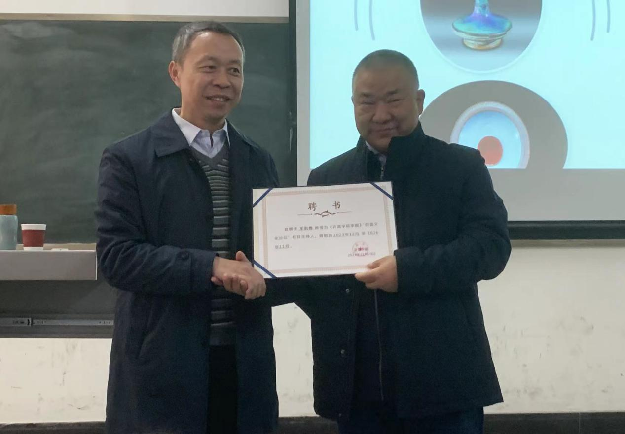 学校副校长杜根远教授为王洪伟教授颁发了“钧瓷文化论坛”栏目主持人的聘书。